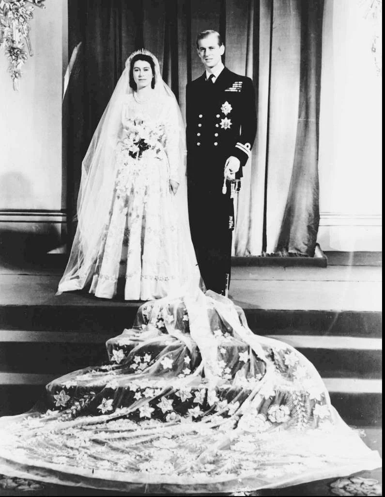 Die Braut schritt am Arm ihres Vaters, des Königs Georg VI., auf hochhackigen Sandalen aus dem gleichen Satin Duchesse durch die Kirche. Am Altar wartete der Bräutigam in seiner dunkelblauen Uniform eines Leutnants der königlich-britischen Marine. Unter den Auszeichnungen für seine Einsätze prangten allerdings nagelneue Orden, die weder seinem Alter noch seinem Rang entsprachen, aber sein Schwiegervater hatte den Bräutigam am Vortag zur königlichen Hoheit und zum Herzog von Edinburgh ernannt. Später kam noch der Titel eines Prinzen dazu.
