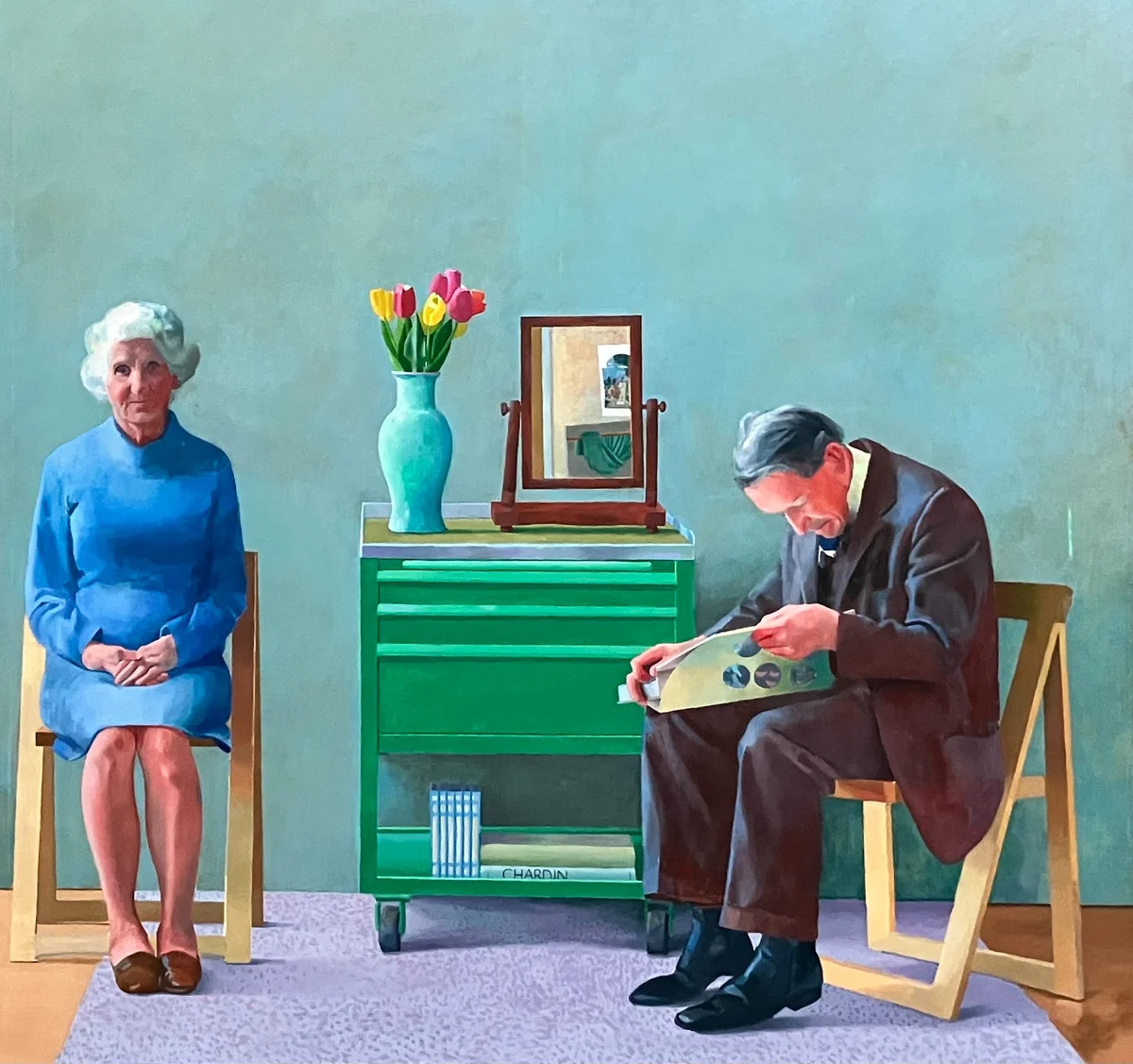 Das wäre verständlich: Das Doppelporträt strahlt eine grosse Ruhe und Abgeklärtheit aus, was auch Chardins Malereien auszeichnet, und es ist, ebenfalls eine Eigenart Chardins, nach klug überlegten klassischen Prinzipien komponiert, was zum Beispiel den Lichteinfall von oben links und die räumliche Wirkung der Position der Eltern betrifft. «My Parents» deutet auch auf weitere Eigenarten von Hockneys Herkommen und seine Kunst, denn der Spiegel zeigt, dass in der Stube der Eltern Bilder hingen – eine Reproduktion von Piero della Francescas «Taufe Christi» aus der Londoner Nationalgalerie sowie eine Malerei (einen grünen Vorhang darstellend) von David Hockney selber. Offenbar war die «radikale Arbeiterfamilie» kultiviert, und offenbar schätzten die Eltern die künstlerische Arbeit ihres 40-jährigen berühmten Sohnes.