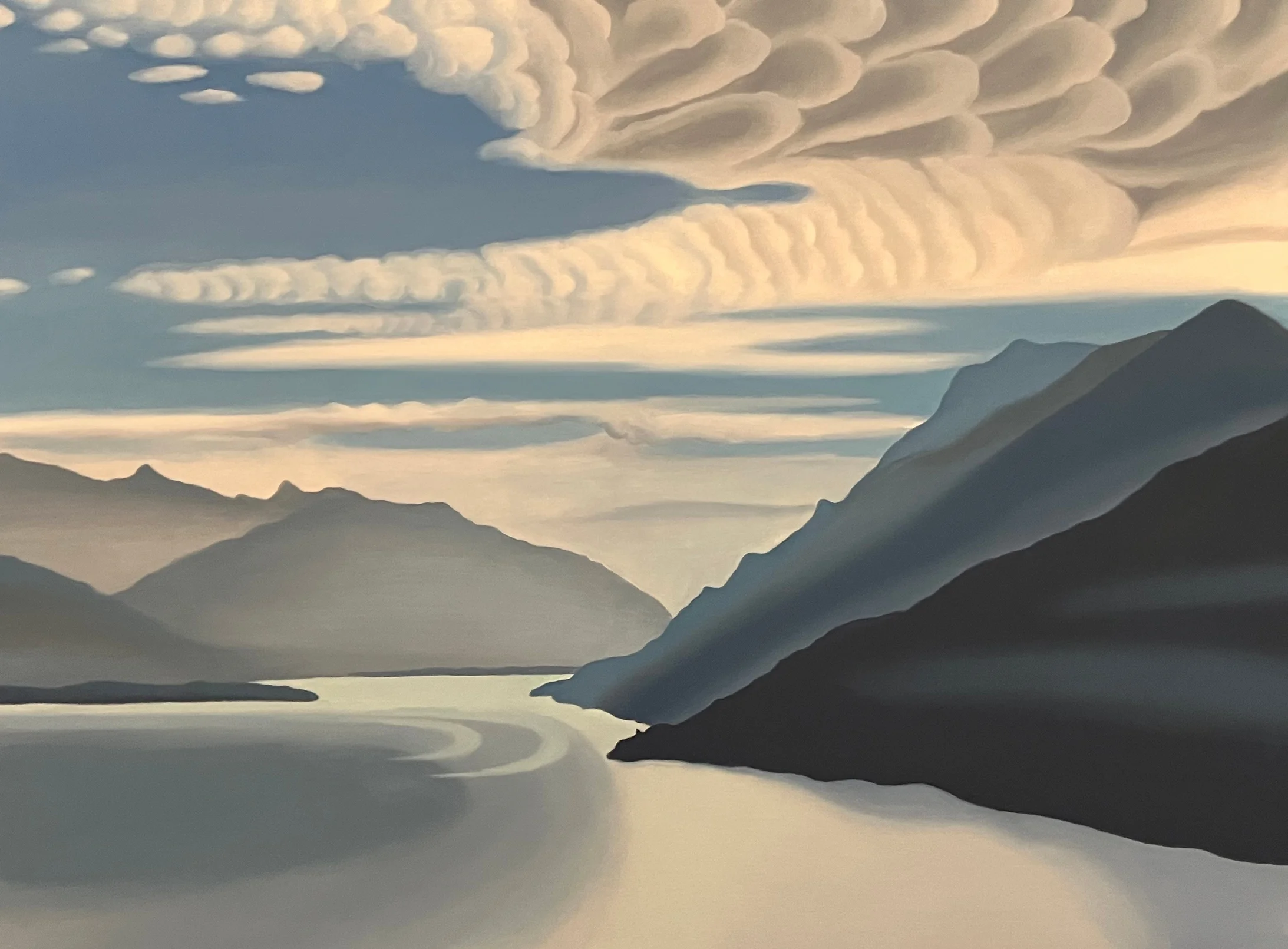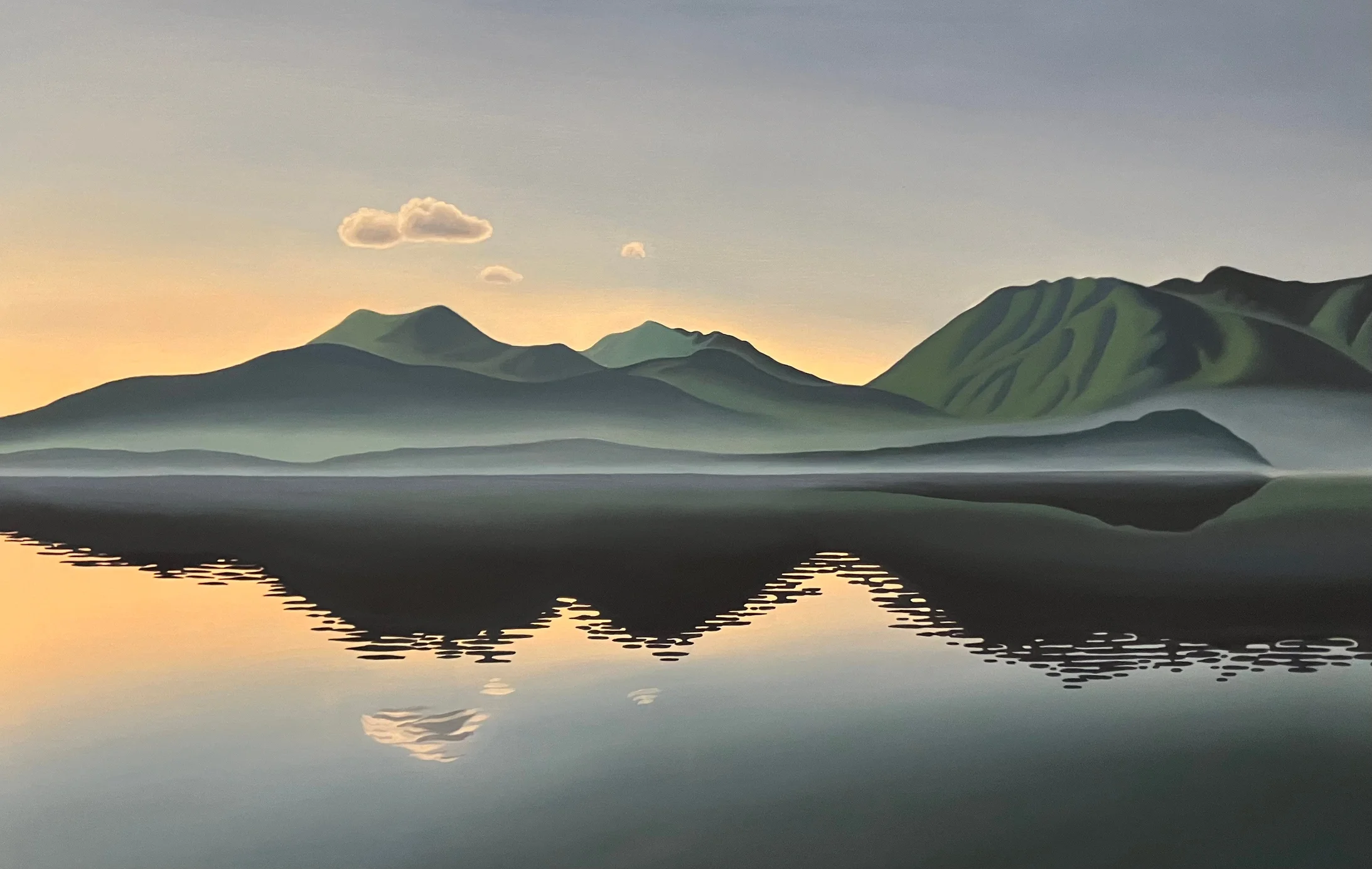 Ähnliches gilt auch von anderen Malereien Thomas Hubers der Serie «Lago Maggiore», auch wenn der Künstler da die Überlagerungen und Ambivalenzen nicht so weit treibt. «11.10.21» zum Beispiel – der Künstler wählt oft das Datum des spontanen Landschaftseindrucks als Bildtitel – ist ein geradezu klassisches Landschaftsbild. Huber lässt uns von oben auf den See blicken. Die Strömung hinterlässt in der silbern glänzenden Wasserfläche ihre Spuren. Licht und Schatten modellieren die gestaffelten Taleinschnitte der Berghänge. Ein Luftzug bringt Dynamik in die hellen Wolken am Himmel als Kontrast zur Ruhe der in den Grau- und Blautönen perfekt austarierten Landschaft. Oder das Bild «April I»: Auch hier sehen wir scharfe Konturen der Hügel und dazu ein bezaubernd sanftes und doch helles Morgenlicht, das die Horizontlinie akzentuiert. Zum Ereignis wird dieses Bild wegen der Verdoppelung des Landschaftskörpers in der Spiegelung auf der Wasserfläche. Diese Verdoppelung ist zugleich Variation: Ein sanfter Wind scheint die Wasserfläche zu kräuseln und lässt die gespiegelte Horizontlinie und ebenso die gespiegelten kleinen Wolken vibrieren. Auch da also, wie in «Bellavista», zweimal das gleiche Motiv, jedoch so verändert, dass wir unwillkürlich zum vergleichenden Befragen der beiden «Bilder», der realen Landschaft und ihrer Umkehrung im Seespiegel, ansetzen.