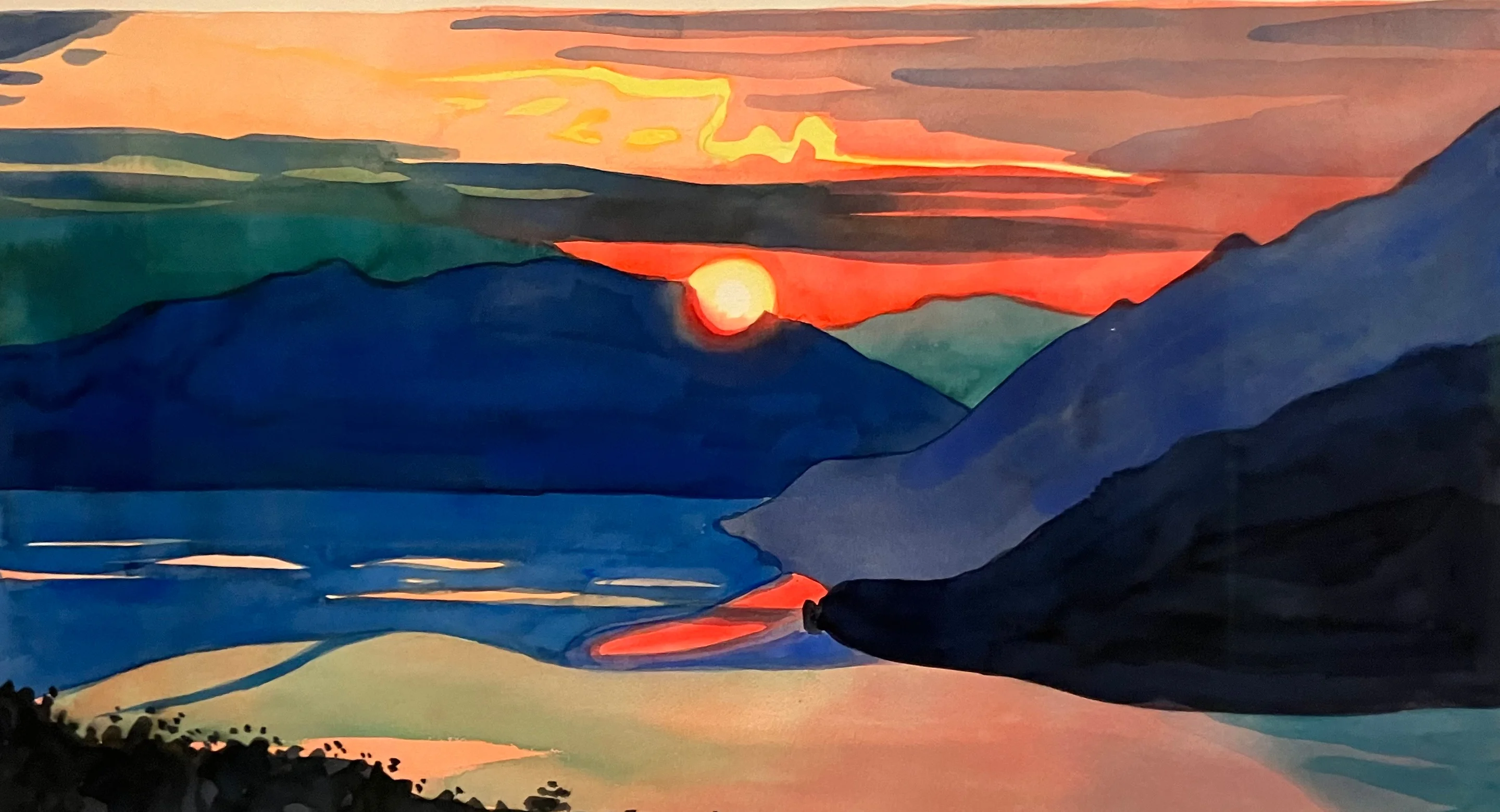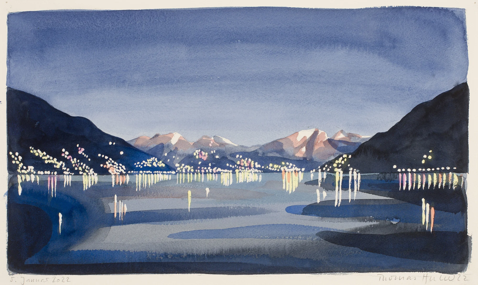 Die Aquarelle, auch sie nicht pleinair als Skizzen vor dem Motiv gemalt, sondern im Atelier, sind als eigenständige Arbeiten gedacht. Sie sind, ihrer Technik entsprechend, näher am emotionalen Erleben der Landschaft. Da gibt es schon mal, wie in «Lago Maggiore III» (2022), den Aufgang einer feurig roten Sonne über dem See, gemalt in raschen Pinselzügen. In «Januar 2022» flimmern die im See sich spiegelnden Lichter auf der Wasserfläche vor den verschneiten Tessiner Bergen und unter einem kalt-hellblauen Himmel. Bei aller Spontaneität, mit der Huber den Pinsel über das Papier zieht: Komposition, die Schärfe der Linien, die Ausgewogenheit der Farben verraten die Könnerschaft des Künstlers.
