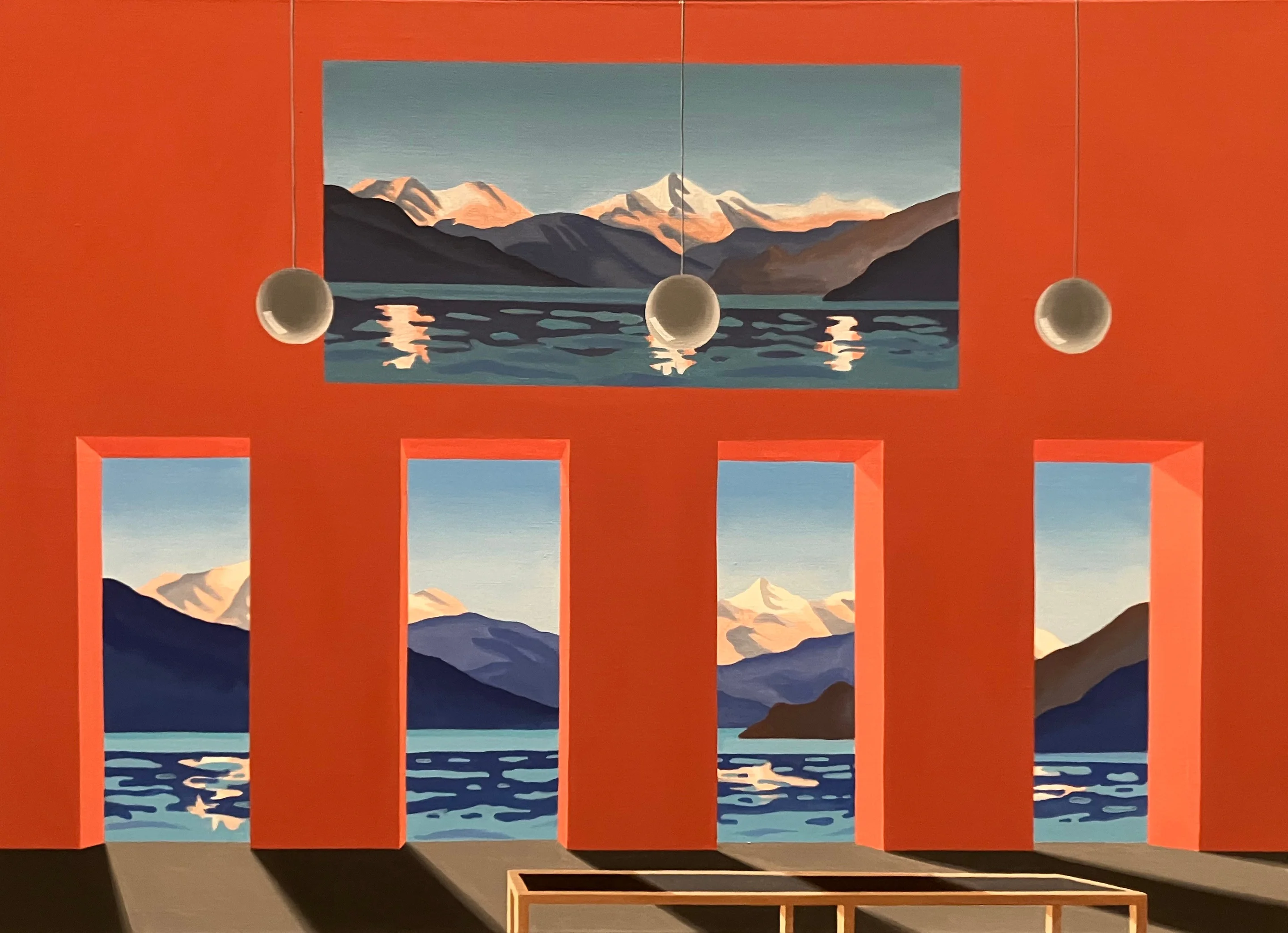 In einem der frühesten Werke dieser Ausstellung, im 2021 entstandenen Gemälde «Bellavista», spielt – eine der wenigen Ausnahmen in der Präsentation – Architektonisches eine wesentliche Rolle. Thomas Huber lässt uns aus einer rot verputzten Halle durch vier Öffnungen über den Lago Maggiore zu den verschneiten Bergen blicken, die sich im Wasser spiegeln. In der Halle steht, als wären wir zum Betrachten der Landschaft eingeladen, eine langgezogene Sitzbank. Merkwürdig und irritierend aber: Über den vier Öffnungen findet sich eine Wandmalerei, die genau und vollständig jene Aussicht zeigt, die jemand, der sich im Raum befindet, wohl in natura, aber wegen der Türpfosten unvollständig vor sich sieht. Vielleicht lässt sich die Strategie Hubers dahingehend interpretieren, dass die Landschaftsmalerei die Landschaft anders zeigen kann, als wir sie in der Wirklichkeit wahrnehmen: Der Künstler lädt uns zum Vergleichen der Bilder ein.