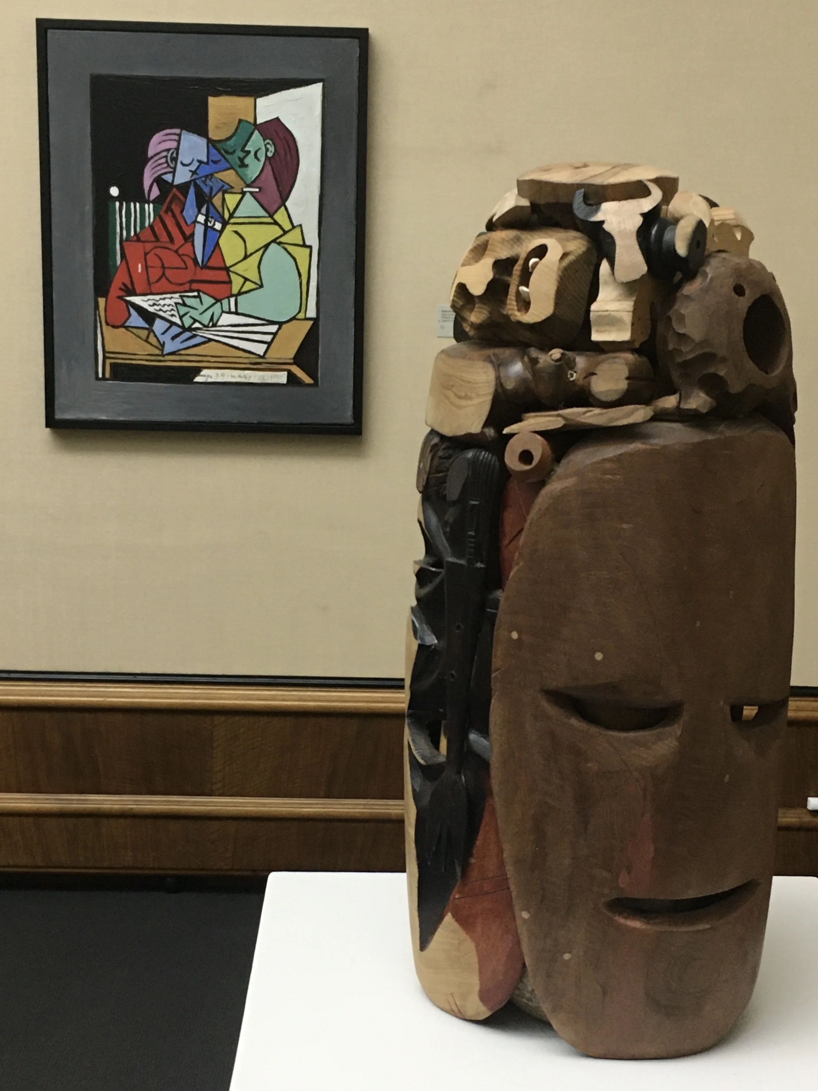 Ein anderes Beispiel ist „The Joys of Eclecticisme“ von 2020, auch das eine Skulptur aus gebranntem weissem Ton. Sie fällt in unser Blickfeld zusammen mit einem Werk von Juan Gris (“Bouteille et compotier“ von 1920). Die Malerei von Gris selber ist keine Bastelei, aber sie schildert ein Stillleben, das ähnlichen Gesetzen gehorchen mag wie „The Joys of Eclecticisme“. 100 Jahre liegen zwischen den beiden Werken. Die Sprache ist eine andere. Die Absicht bleibt sich ähnlich. Oder „Pille, Maske und Fee“ aus Holz von 2016: Wir sehen dieses Gebilde, das an die Jahreszeiten-Bilder des manieristischen Malers Giuseppe Arcimboldo erinnert, zusammen mit Picassos „Deux Personnages“ von 1934 und stellen auch da eine verwandte Strategie der Dekomposition und neuen Komposition fest als Zeichen des Weltverständnisses eben nicht nur von Lutz & Guggisberg.