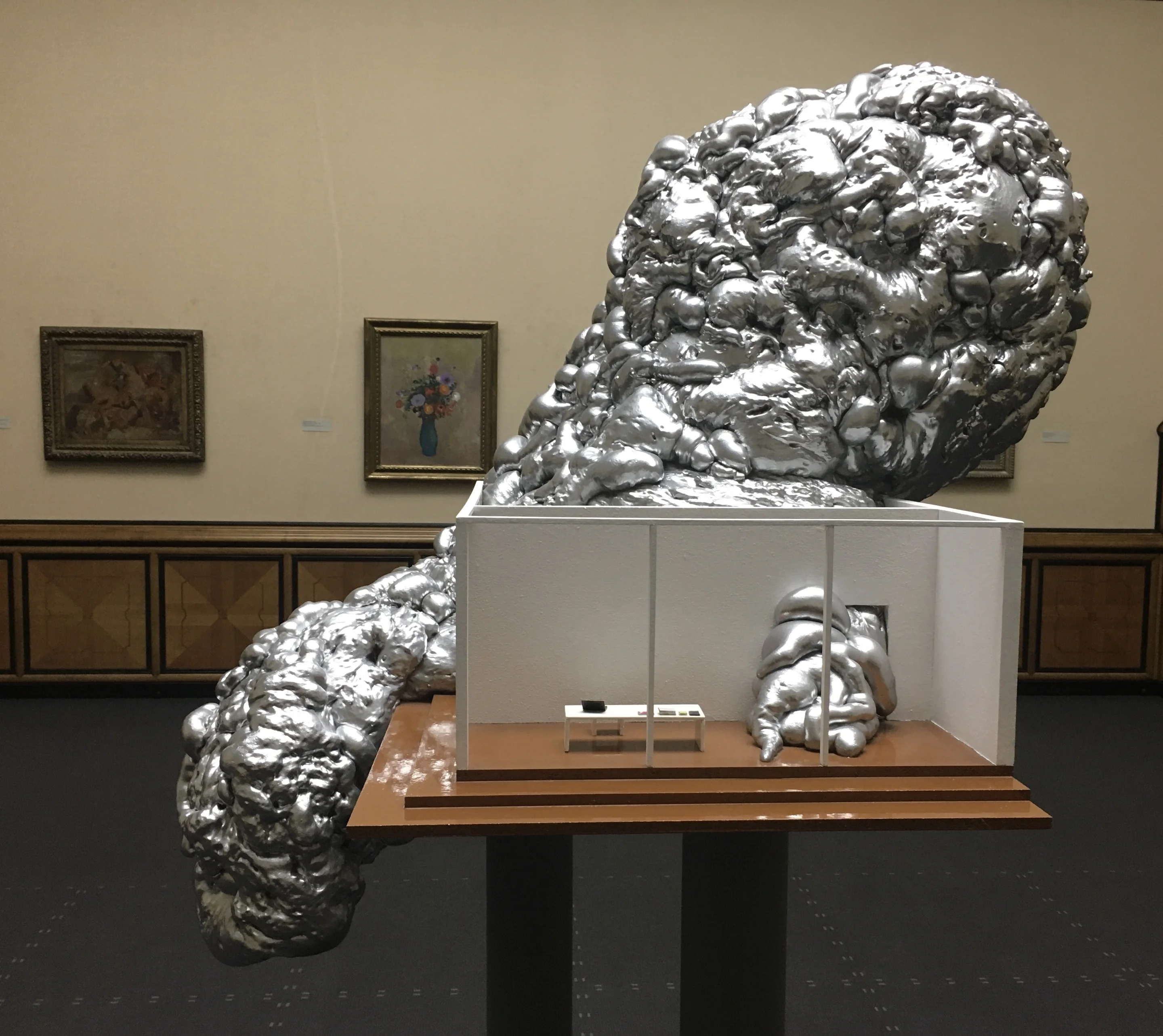 Ein letztes Bespiel ist „Phänomena 2000“ von 2000: Da sind die beiden Pole in einem Werk vereint – der Kunstbetrieb mit White Cube, Büro und Laptop (als Modell) und die Kunst, die sich diesem Schema des Gängigen nicht fügen will, sondern als amorphe silberne Masse aus allen Löchern quillt. Auch das ist ein Werk über die Kunst und ihren Stellenwert.