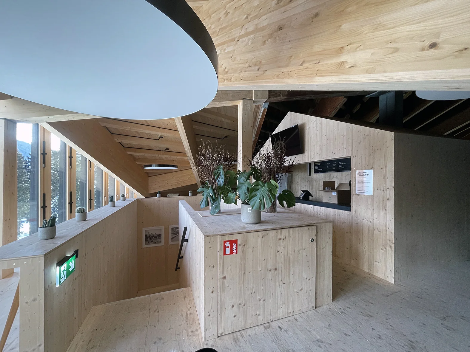 Der Sockel der Ummantelung besteht weitgehend aus rohem Beton. Je höher man steigt, umso grösser ist der Anteil an Holz, bis man knapp unter der Decke ausschliesslich von den gebogenen und ineinander verzahnten Holzträgern umgeben ist. Hier richteten die Luzerner Architekten denn auch für die Präsidentenloge den verblüffendsten Raum ein. Unmittelbar unter den Schrägen der Dachkonstruktion hat man einen Ausblick auf die Umgebung wie auch durch schmale Öffnungen auf das Spielfeld. Für die Nasszellen und die Theke stellten Marques und Schlumpf eine Art Urhütte hinein.