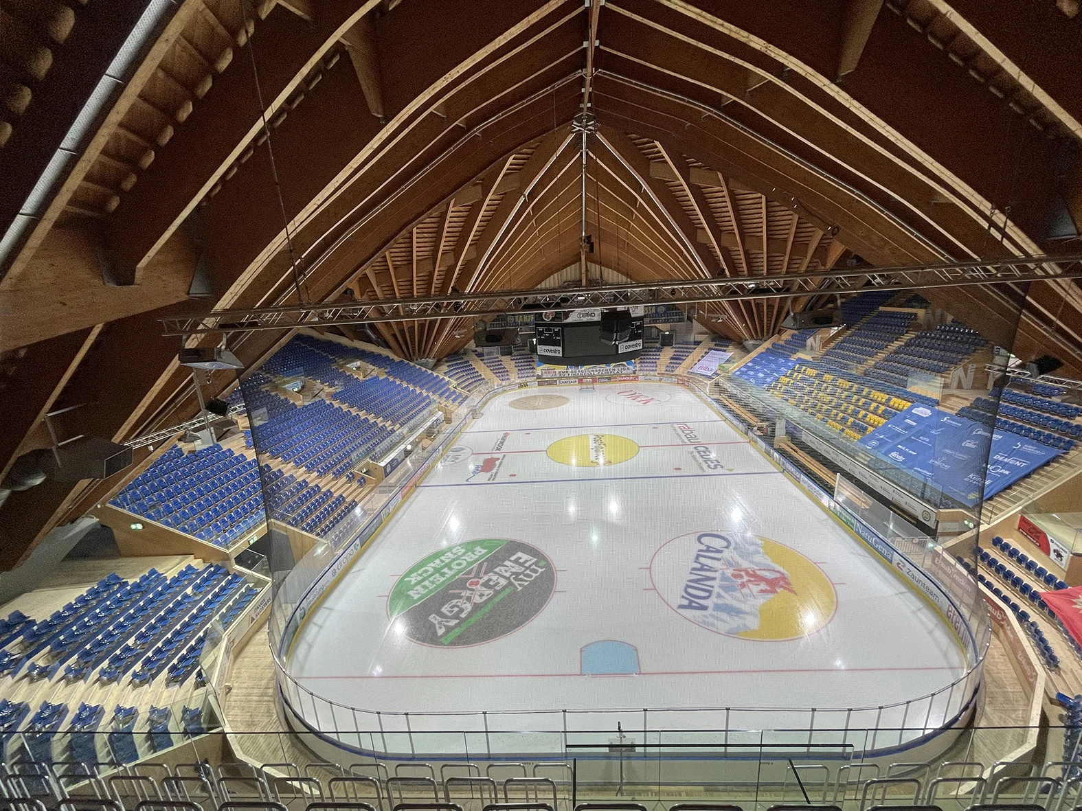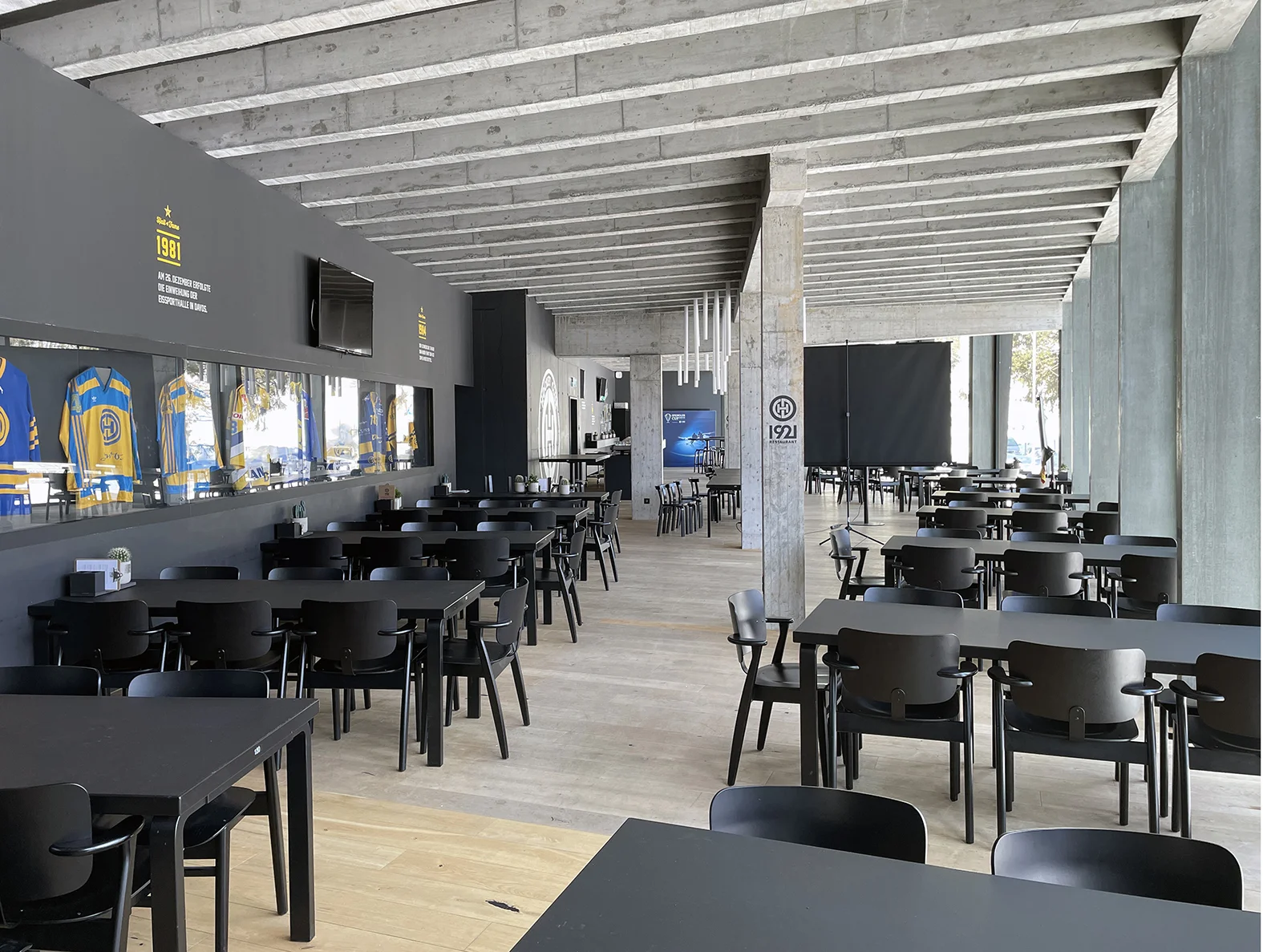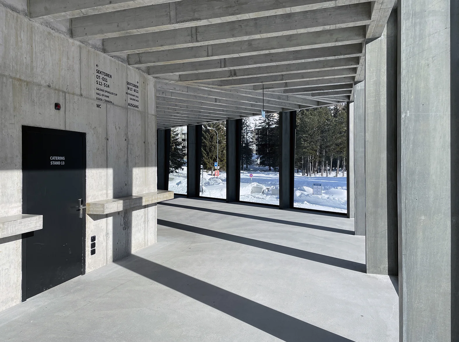 In der Tat bleibt das Eisstadion mit der gewaltigen Bedachung auch nach dem Umbau als das vertraute Denkmal erhalten. Der wichtigste Eingriff im Äussern ist auf den ersten Blick fast nicht erkennbar, und doch vermag erst dieser Zusatz, das Stadion formal ideal zu verdichten. Es handelt sich um einen auskragenden, von rohen Betonbalken gestützten Umgang, der die Zirkulation um das ganze Stadion überhaupt erst erlaubt. Der Grundriss der Überdachung, die ein fettes Kreuz zeichnet, wird zu einem Achteck erweitert. Die Marques Architekten AG verzichtete auf luxuriöse Werkstoffe zugunsten von schalungsroh belassenem Beton und unbehandelten Holzpanelen. Besucherinnen und Besucher dürften das subtile Lichtspiel, das sich beim Abschreiten des Ringes einstellt, kaum bemerken. Abschnitt für Abschnitt ergeben die Blicke auf die Umgebung sozusagen ein 360-Grad-Panorama. Die in den Ecken der Bedachung gewonnenen Flächen dienten dazu, die benötigten Fluchttreppen zu integrieren. Das Restaurant ist Teil des Ringes und gleichzeitig ein in sich abgeschlossener Raum, der mit Alvar-Aalto-Tischen und -Stühlen bestückt ist. Speziell sind die von der Decke herunterhängenden Leuchtstäbe, die an Eiszapfen erinnern sollen.