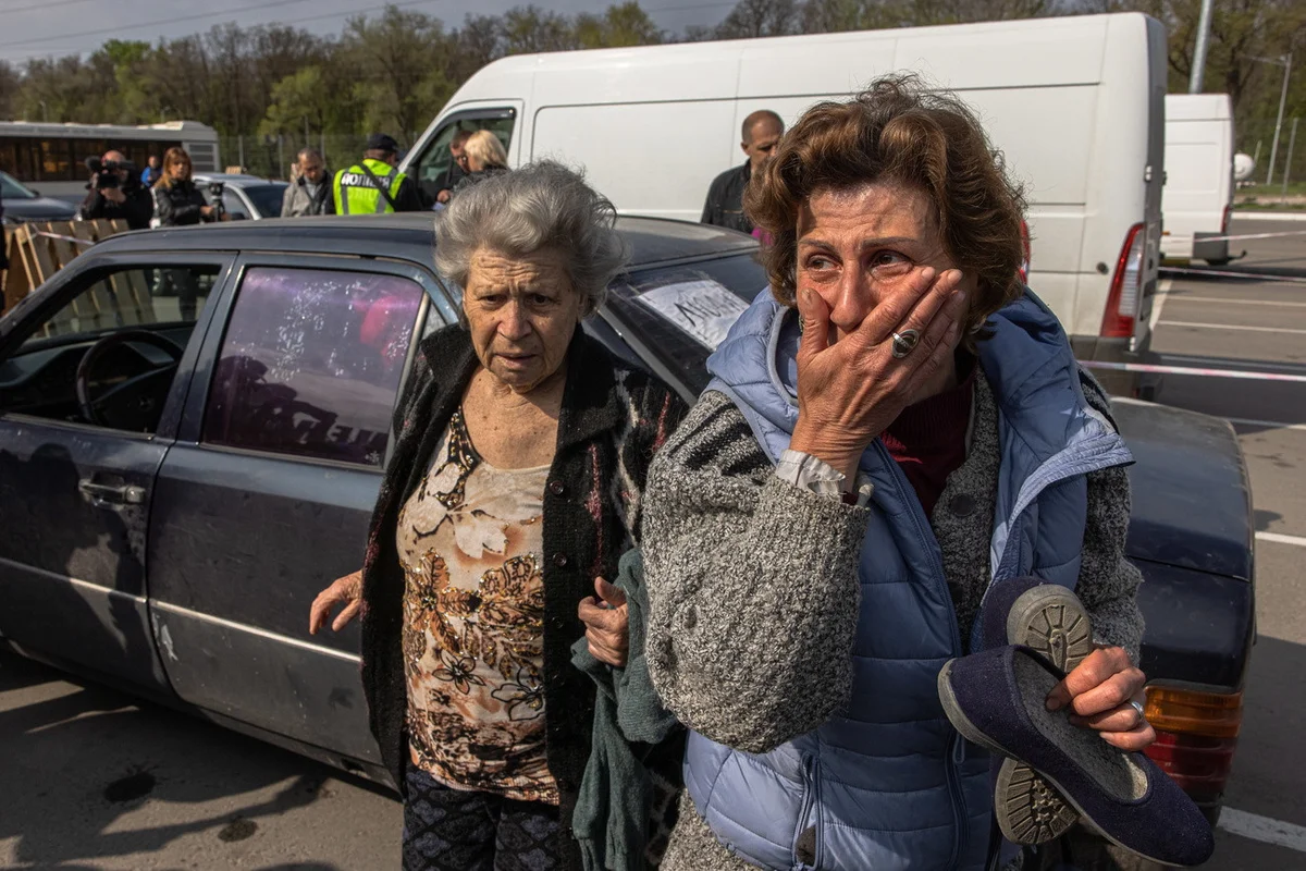 Natalia (rechts) und ihre Mutter Dina treffen am Montagmorgen in Saporischschja ein. Sie gehörten zu etwa hundert Menschen, die am Sonntag aus der belagerten Hafenstadt Mariupol evakuiert wurden. «Die Hölle gibt es», hatte der Bürgermeister der Schwarzmeer-Stadt gesagt. «Und die Hölle – das ist Mariupol.»