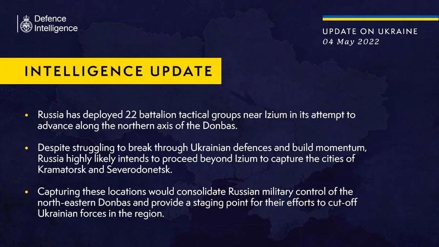 Russland hat 22 taktische Bataillone nahe der ostukrainischen Stadt Isjum zusammengezogen, heisst es im jüngsten Update des britischen Militärgeheimdienstes. Es sei sehr wahrscheinlich, dass die russischen Truppen über Isjum bis zu den Städten Kramatorsk und Sjewjerodonezk vorstossen wollen. So wollen sie eine Ausgangslage schaffen, um die ukrainischen Truppen im nordöstlichen Donbass abzuschneiden.