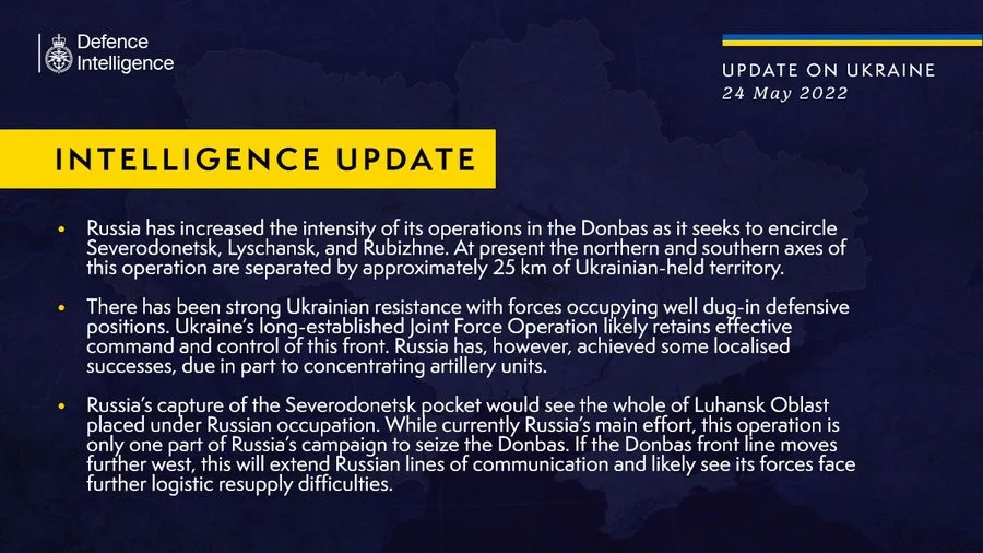 «Russland hat jedoch einige lokale Erfolge erzielt, was zum Teil auf die Konzentration von Artillerieeinheiten zurückzuführen ist», schreibt der britische Militärgeheimdienst. Die Einnahme von Sewerodonezk durch russische Truppen wäre ein schwerer Schlag für die Ukraine. Die Russen würden damit die gesamte Region Luhansk kontrollieren. Unterstützt werden die russischen Truppen von pro-russischen Milizen aus den Regionen Luhansk und Donezk, sowie aus frisch rekrutierten russischen Verbänden und aus jenen Truppeneinheiten, die nach dem Fall von Mariupol in den Osten des Landes verlegt wurden.