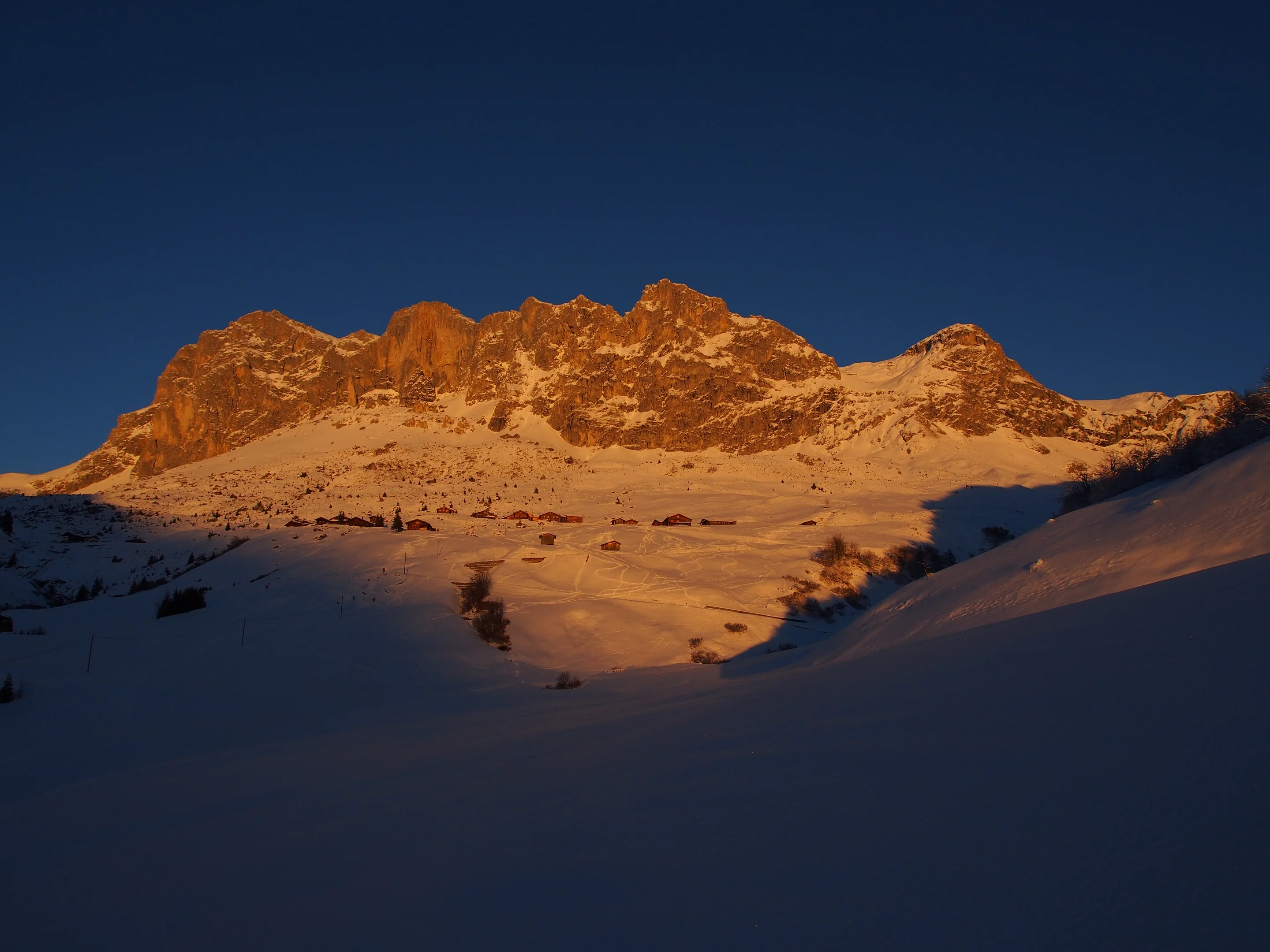 Man traut seinen Augen nicht. Da sind keine grossen Bergbahnen auszumachen, keine Wasserspeicher für Schneekanonen, keine Mittelstationen, keine Gipfelrestaurants und keine Parkhäuser. Alles ist frisch verschneit und friedlich, aus der Vogelschau hat man das Gefühl, auf einer Postkarte von 1920 gelandet zu sein. Oder in einem Heidifilm.