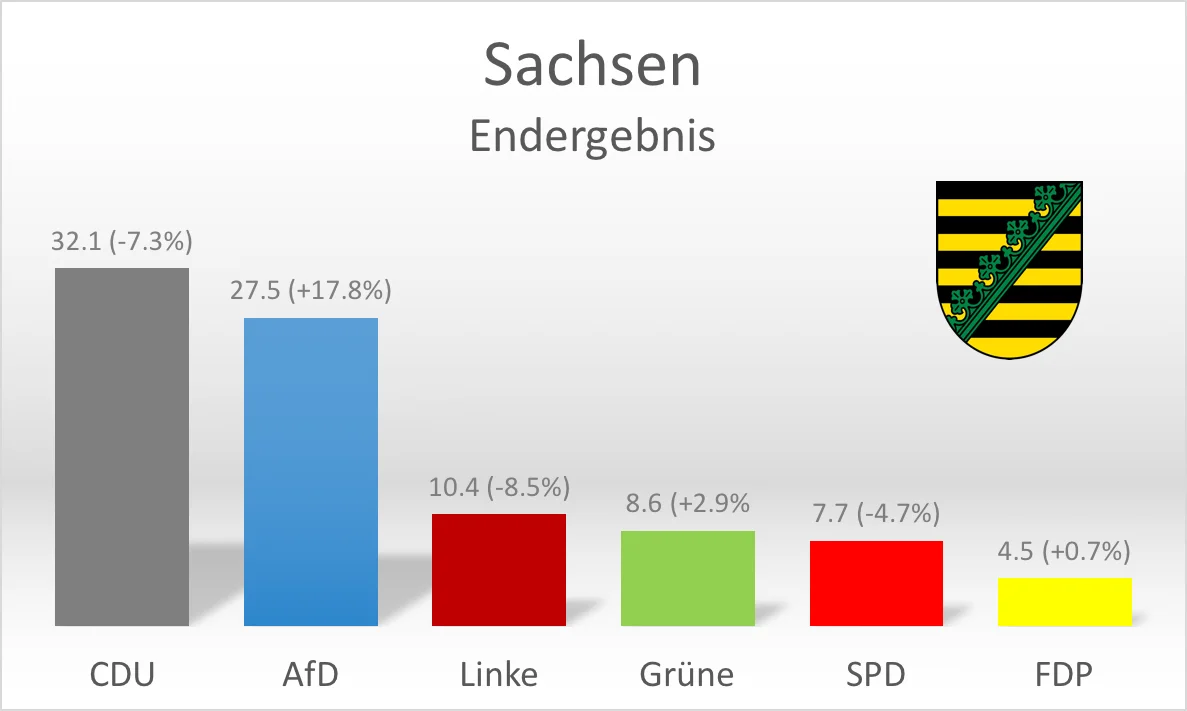 Grosse Siegerin bei den Landtagswahlen in Sachsen und Brandenburg ist die AfD. Sie schnitt deutlich besser ab als prognostiziert. In Sachsen gewinnt sie 17,8% dazu, in Brandenburg sind es +11,3%.