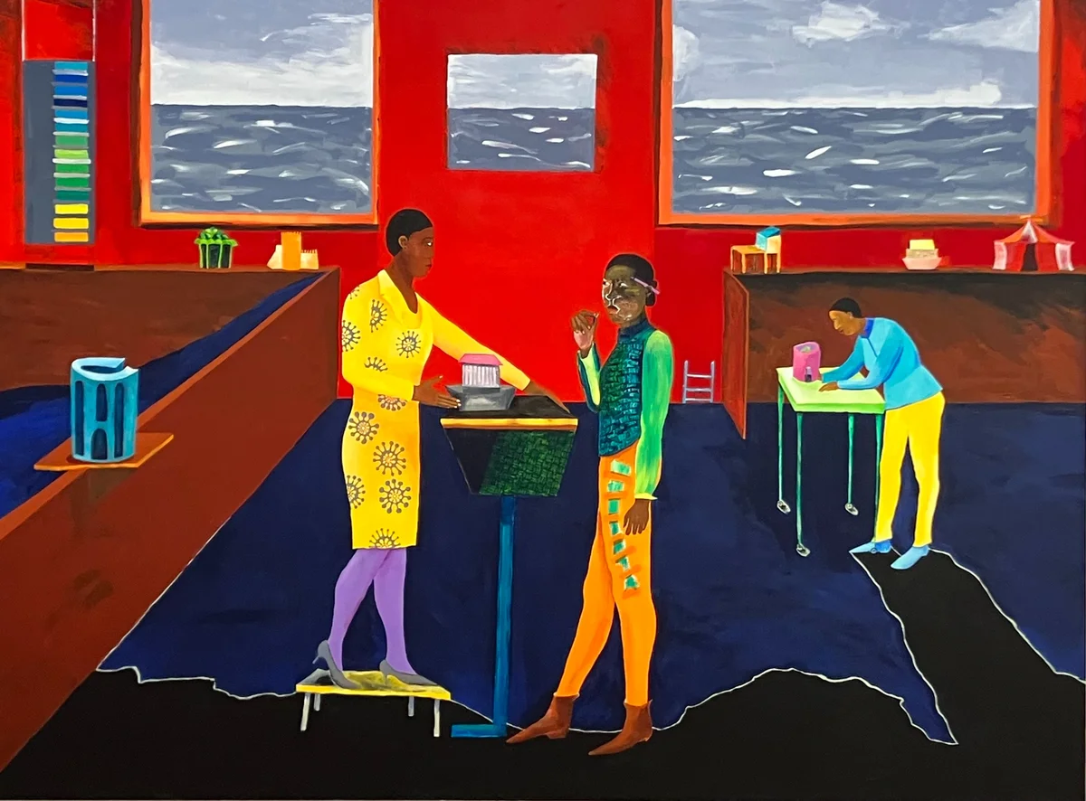 Die bunt und flächig gemalten Bilder irritieren. Sie erzählen scheinbar klar von schwarzen Menschen in Innenräumen, aus denen man aufs Meer blickt. Doch das Wesentliche geschieht nicht im Bild, sondern im Hintergrund.