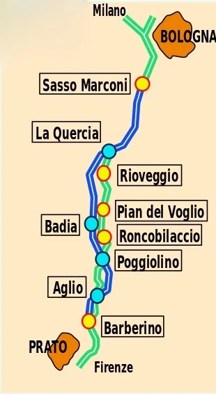 Die alte Autobahn (hier grün eingezeichnet) überquert den Apennin auf einer Höhe von 726 Metern über Meer. Um auf diese Höhe zu gelangen, schlängelt sich die Autostrada über weite Strecken dem Berg entlang. Die neue Strecke (blau) liegt dank eines richtungsgetrennten 8,6 Kilometer langen Basistunnels auf höchstens 490 Metern Höhe. Dieser Tunnel ist das Prunkstück des Bauwerks. Damit wurde eine geradere Streckenführung möglich. Da die Autos weniger hoch hinauffahren müssen, würden pro Jahr hundert Millionen Liter Benzin eingespart, hiess es an der Eröffnung.