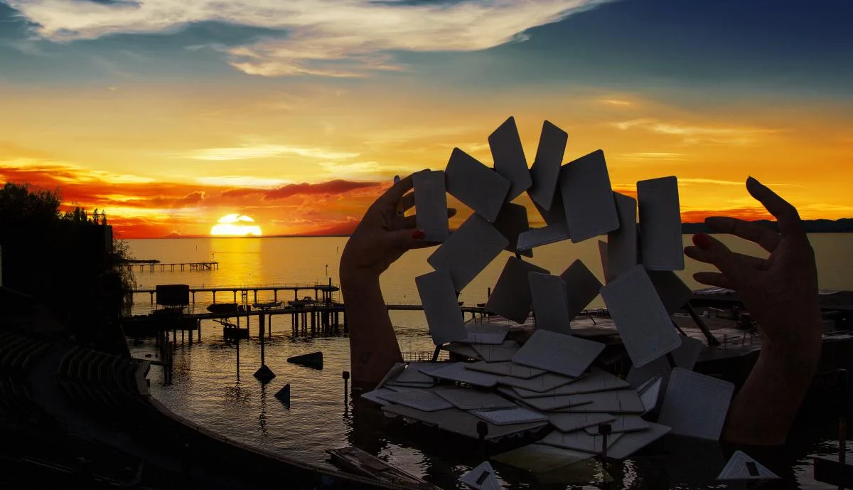 Eine der beliebtesten Opern überhaupt wird auf der Seebühne gezeigt: «Carmen» von George Bizet, das Drama um Liebe und Eifersucht, spektakulär in Szene gesetzt vom dänischen Regisseur Kasper Holten in einem nicht minder spektakulären Bühnenbild von Ev Devlin. Zwei Riesenhände mit rotlackierten Fingernägeln und zarten Rosen-Tattoos auf den Unterarmen werfen 59 überdimensionierte Spielkarten in die Luft. Es ist der Moment, in dem Carmen ihre Zukunft aus den Karten liest.