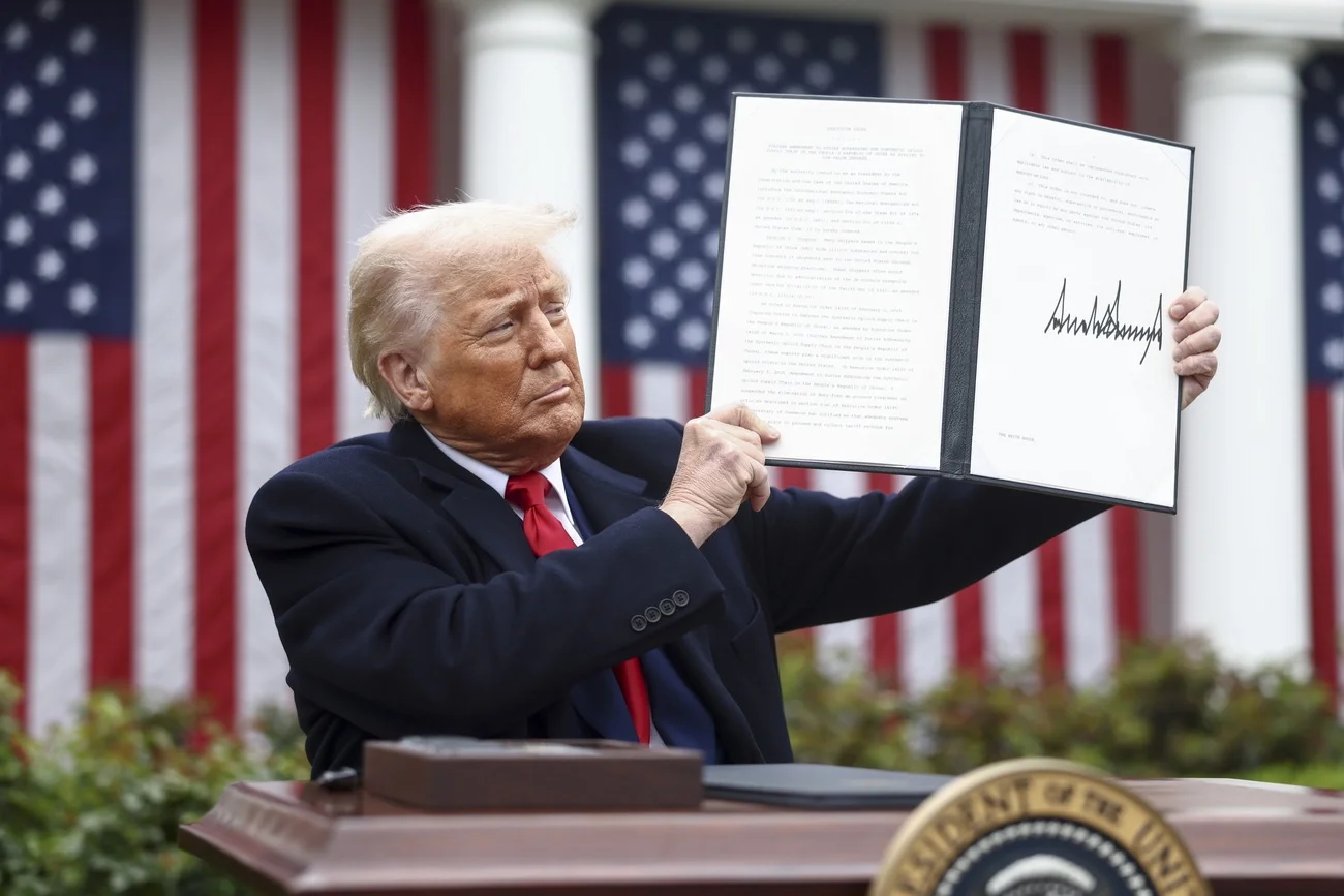 US-Präsident Donald Trump zeigt die unterzeichnete Executive Order zur Einführung neuer reziproker Zölle gegen US-Handelspartner. Für Trump ist dies der «Liberation Day» der Vereinigten Staaten. Die meisten Wirtschaftsexperten befürchten jedoch, dass am Ende die Kosten von den US-Verbrauchern getragen werden und dass der Beschluss den ganzen Welthandel und damit auch die USA schwächen wird.