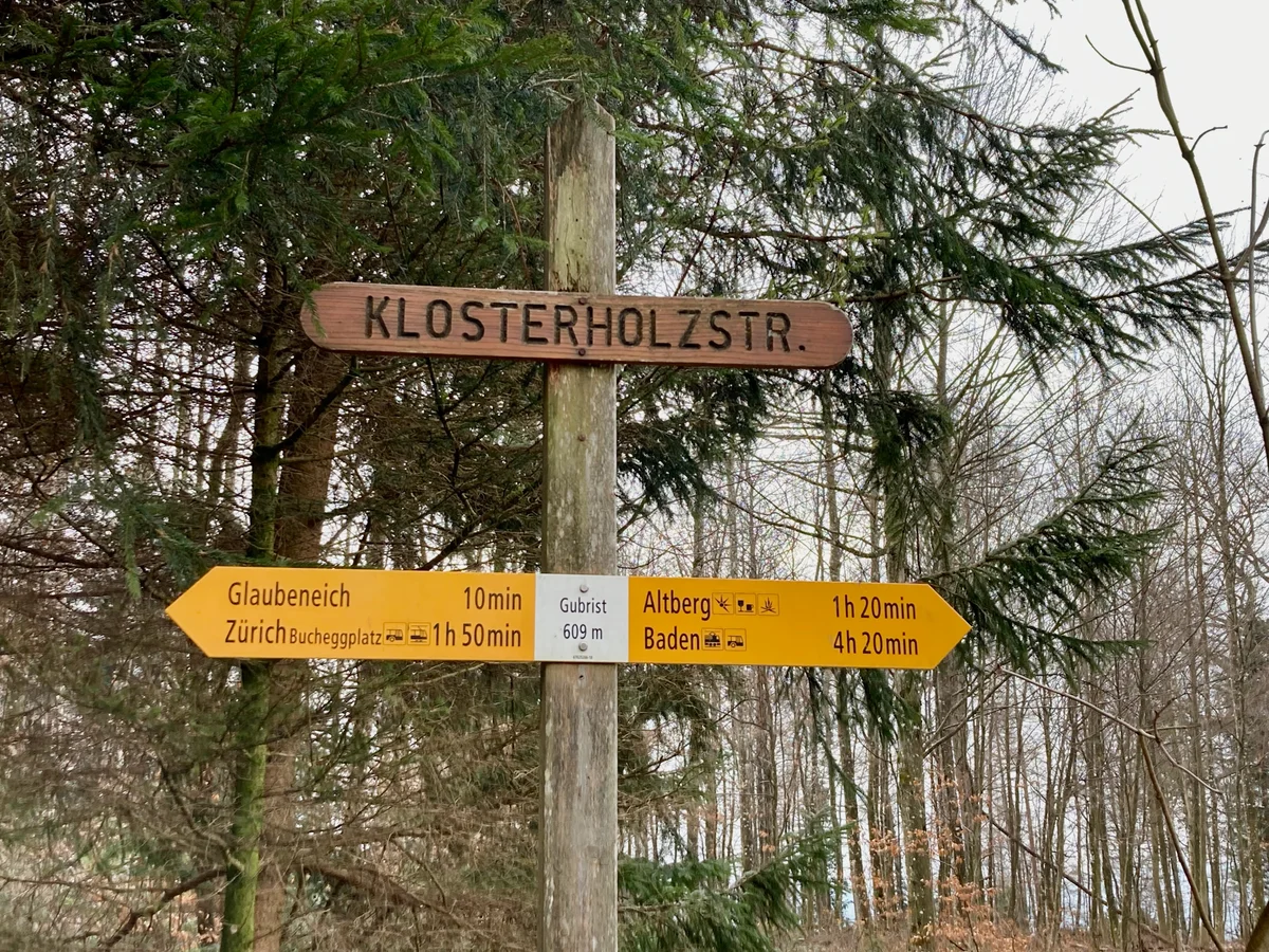 Doch wo bleibt der Gubrist-Berg? – Fast hätte ich ihn verpasst. Nur wenige hundert Meter weiter westlich verkündet ein gelber Wegweiser den ersten Gipfel meiner Wanderung, zwar nicht ganz am höchsten Punkt (der wäre beim Höhenpunkt 615 Meter über Meer, wo eine Antenne steht), aber doch so nahe, dass ich in meiner persönlichen Gipfelchronik den Gubrist als bestiegen abhaken kann.