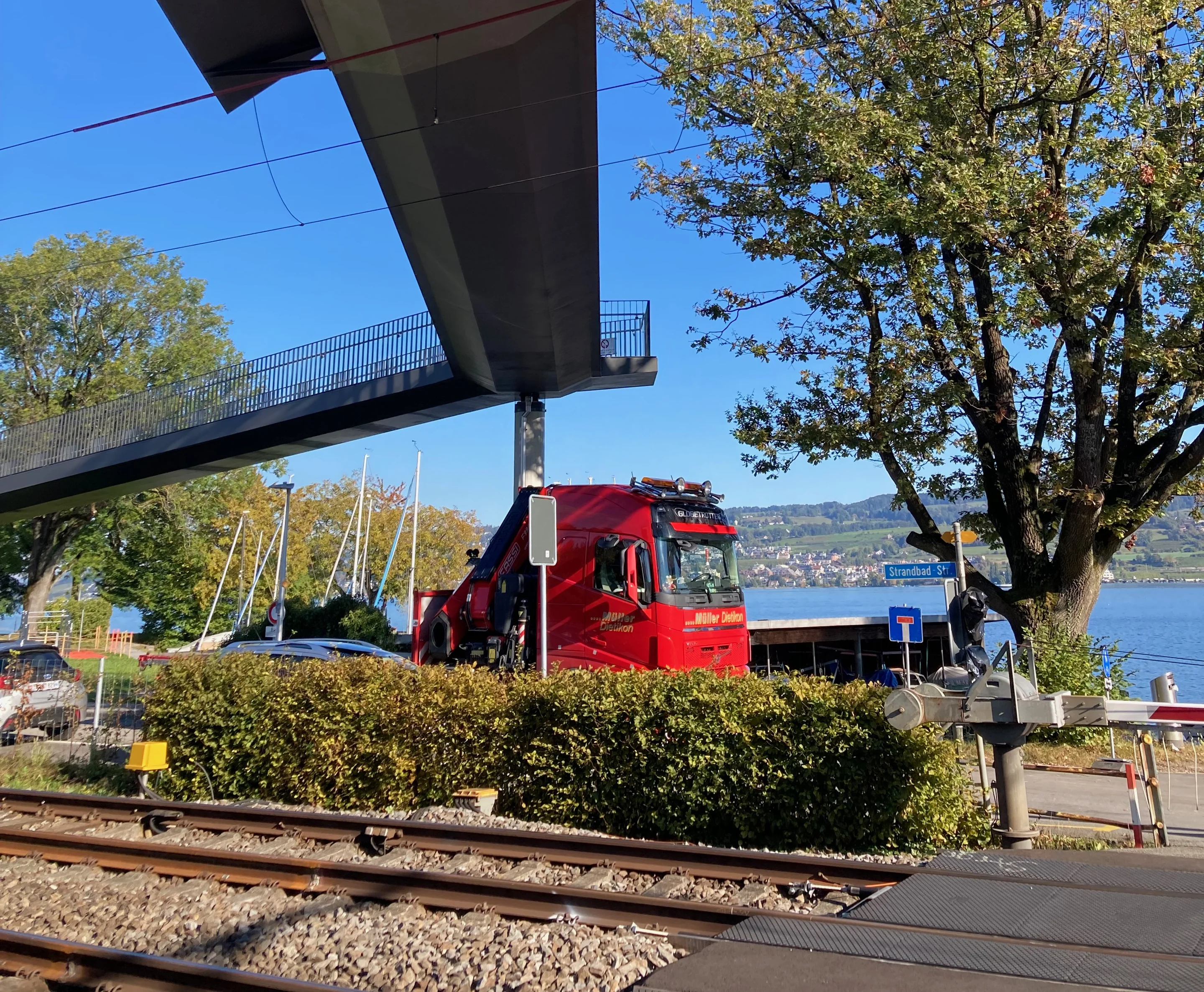 Hier wartet eine weitere geschlossene Barriere auf die Wanderer. Jenseits der Gleise brummt der Motor eines rotes Lastwagens, der wahrscheinlich Material zu jener Baustelle gebracht hat, welche uns den Durchgang auf dem Uferweg versperrt. Zwar gäbe es hier eine elegante Fussgängerbrücke, welche sich diagonal über Seestrasse und Bahn schwingt, nur dass der Ortsunkundige, der bereits am Gleis steht, nicht weiss, wo genau die Brücke beginnt. So warten wir erneut und beobachten die Vielfalt der Züge auf der linksufrigen Bahnstrecke. Nun hat auch der Chauffeur des Lastwagens resigniert und den Motor abgestellt. Mit Erstaunen beobachten wir, dass auf der Uferstrasse von Horgen her ständig Velofahrer vorbeifahren. Sind wir die einzigen Dummen, welche die Sperrung der Strasse ernst genommen haben? Gerade als wir uns schliesslich doch für den Brückenzickzack entscheiden, heben sich lautlos und majestätisch die rot-weissen Balken, als wären sie stolz darauf, die ungeduldigen Wanderer in ihre Schranken gewiesen zu haben.