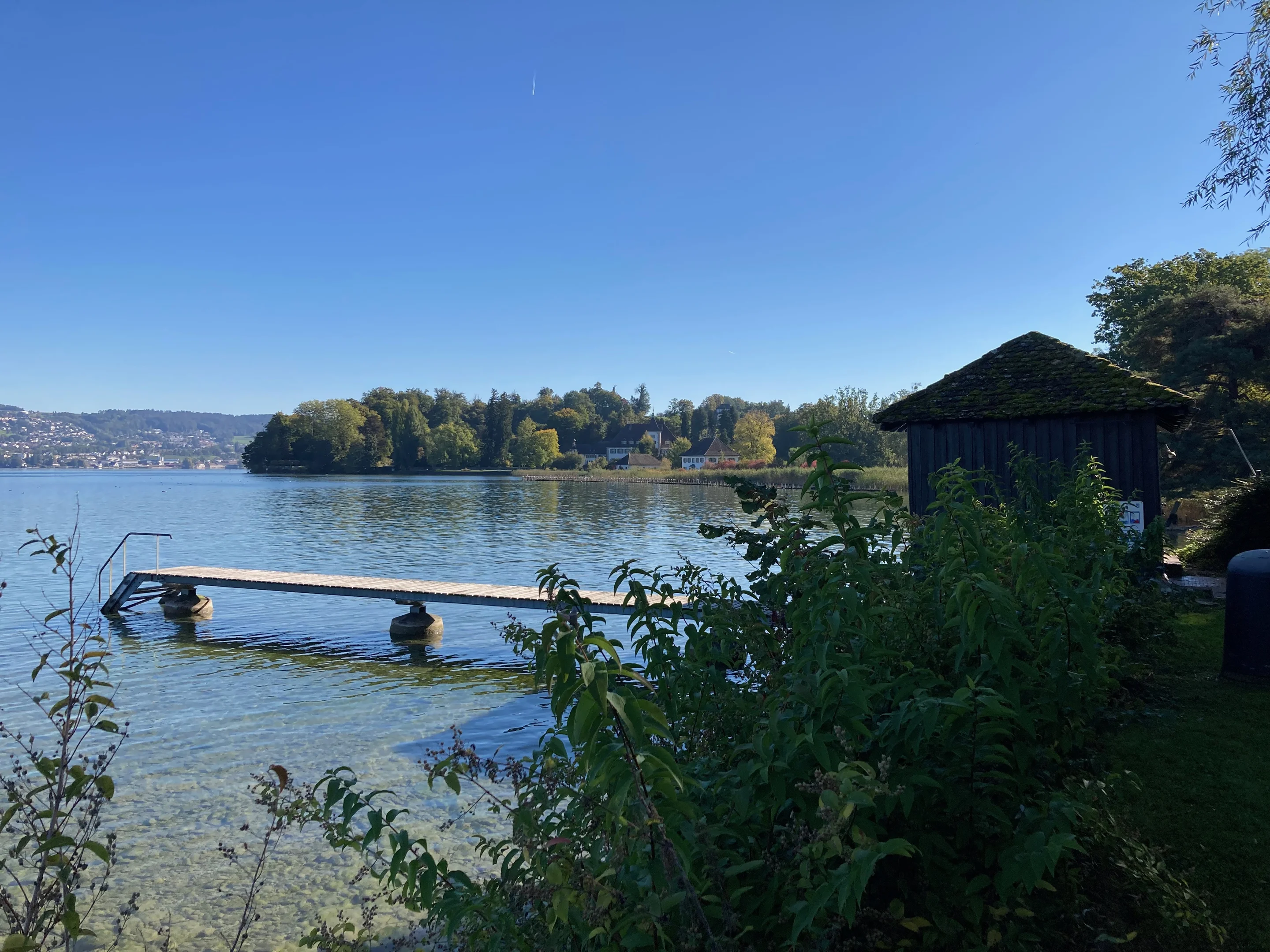 Während die Fähre, verfolgt von heiser rufenden Möwen, das Wasser des Zürichsees durchpflügt, scheint während knappen zehn Minuten für eine vom Zufall zusammengewürfelte kleine Menschengruppe die Zeit stillzustehen: Der Kassierer, die Velofahrerin mit der grossen Einkaufstasche auf dem Gepäckträger, der Töfffahrer in Ledermontur, der bei der Ankunft in Horgen seine Pfeife anzünden und diese, dem Integralhelm zum Trotz, genüsslich in den Mund stecken wird, die blonde Dame im Sportkabriolett und wir, die das göttliche Geschenk eines goldenen Herbsttages für eine kleine Wanderung nutzen.