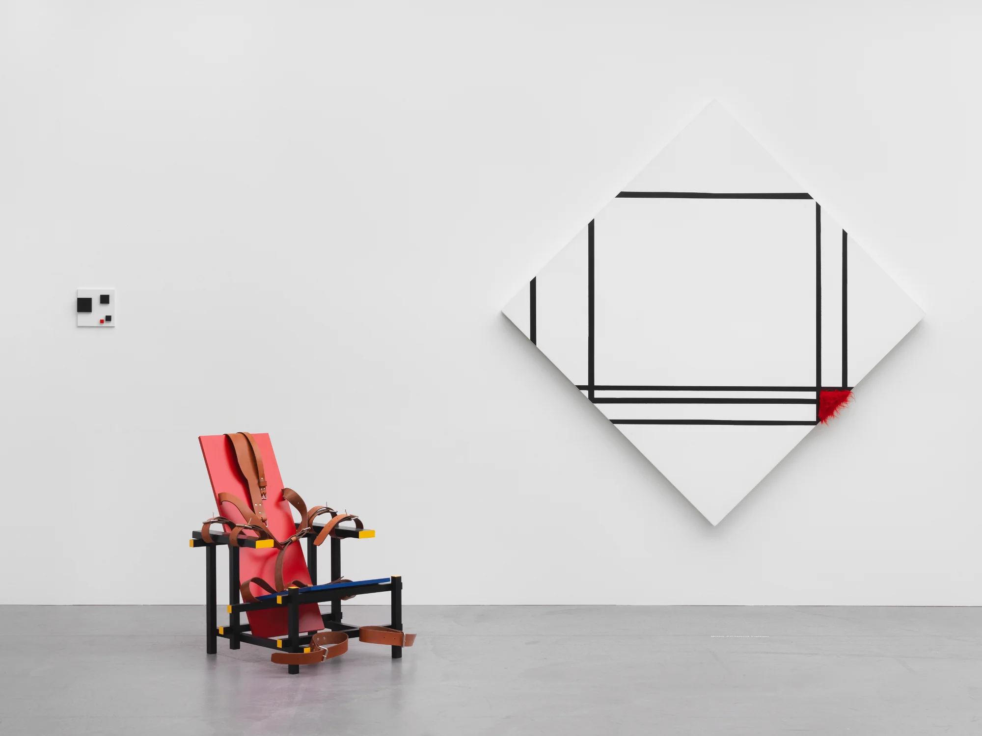 An diesem ikonischen und vieldeutig sprechenden Objekt hat Christoph Büchel nichts verändert. Er versieht es lediglich mit neun massiven Ledergurten, mit denen man eine sitzende Person straff an den Stuhl fesseln könnte. Die nächstliegende Assoziation ist selbstverständlich der Elektrische Stuhl. Bloss ergibt sie keinen rechten Sinn: Rietvelds farbenfrohe, luftige Möbelkonstruktion hat mit einem Hinrichtungsinstrument nichts zu schaffen.