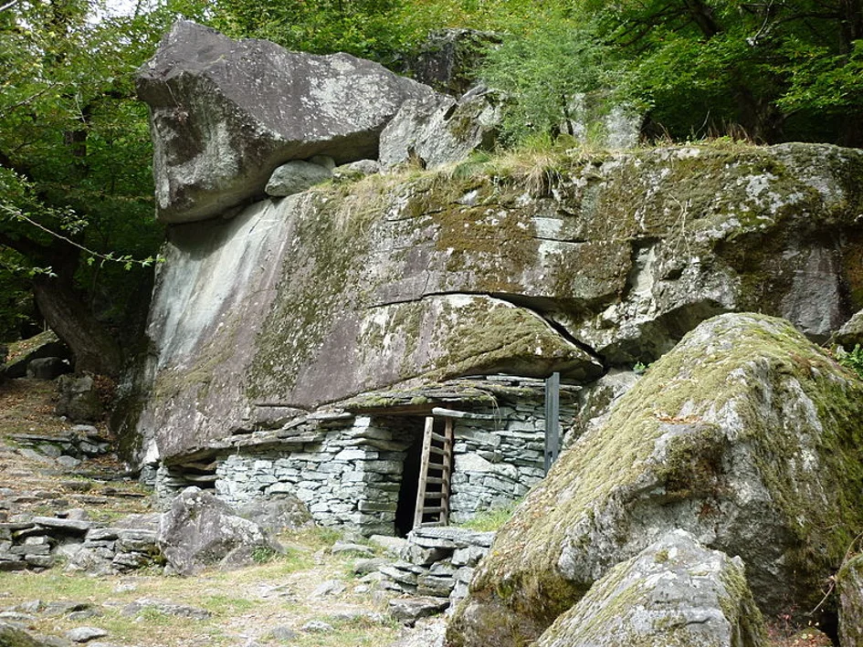 Mich selber zieht es immer wieder in diese Gegend. Es ist ein anderes Tessin als jenes der Sonnenstubenromantik mit dem Boccalino Merlot unter schattenspendenden Kastanienbäumen. Ein Dolce Vita ist hier nicht in Sicht. Im Gegenteil. Das Durchqueren des Val Bavona lässt erahnen, wie Menschen der Natur eine kärgliche Existenzgrundlage abgerungen haben. Unter härtesten Umständen. Davon zeugen auch die Terrassen und Treppen und die zahlreichen Unterstände. Eine Art anonymer Felsarchitektur von Grotten und Höhlen, eine «Architektur ohne Architekten». (4) Besonders beeindruckend sind die Splüi, von Trockenmauern eingefasste Felshöhlen. Sie dienten einst als Wetterschutz für Mensch und Vieh, als Vorratskammern oder gar als Backstube. Nicht selten sind sie nun vom Wald überwuchert.