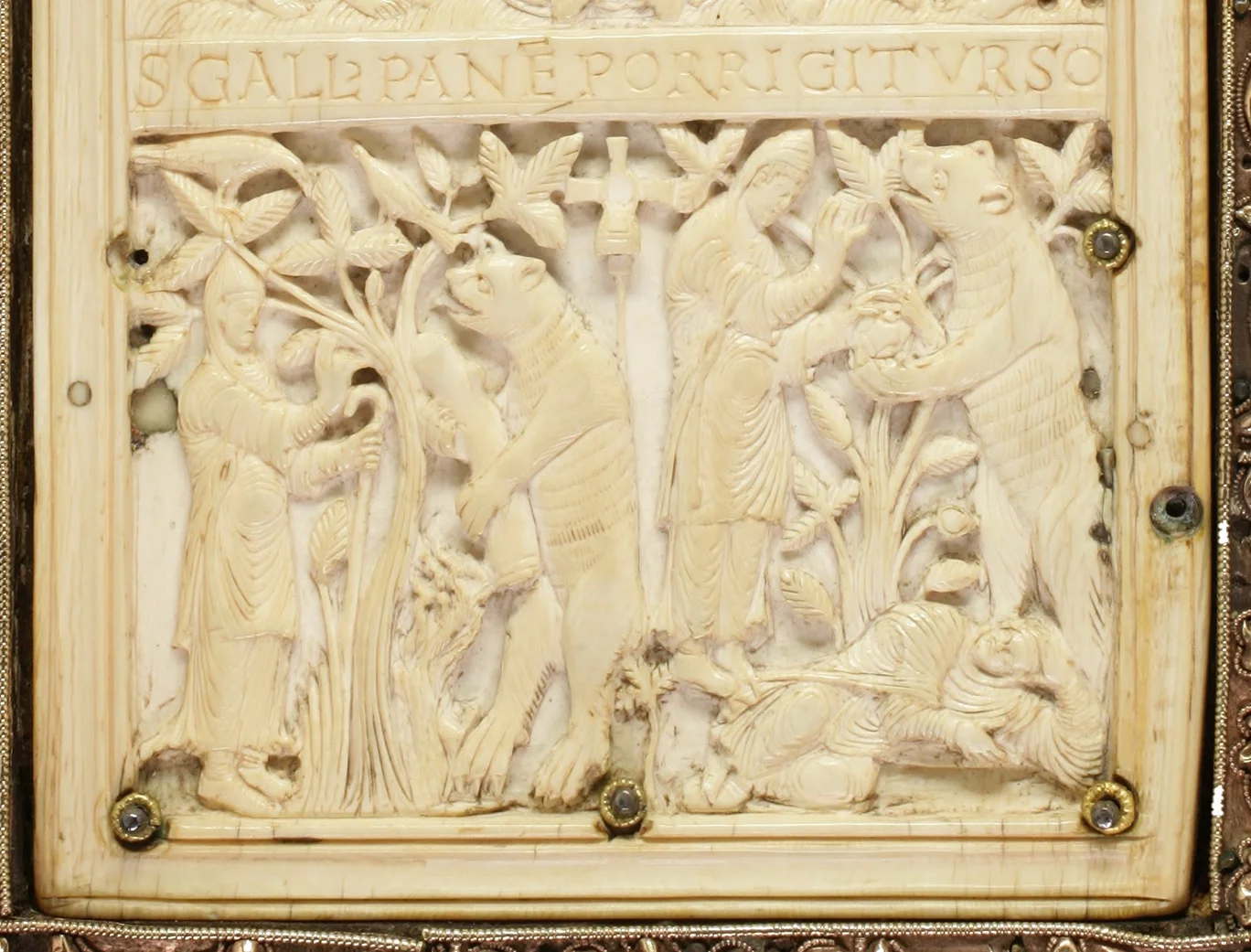 Wälder waren eine wichtige Einkommensquelle des Klosters, das seine Besitzungen seit seiner Gründung im 8. Jahrhundert stetig ausgedehnt hatte bis weit in den süddeutschen Raum und ins Elsass hinein. Durch den Wald hatte sich auch im Jahr 612 der irische Mönch Gallus vom heutigen Arbon aus ins Hochtal der Steinach gequält. Das zeigt jene wertvolle Elfenbeintafel, mit der Abtbischof Salomon gegen Ende des 9. Jahrhunderts das so genannte «Evangelium Longum» einfassen liess. Sie stellt Gallus dar, wie er einem Bären ein Brot reicht – es ist der Dank für das Feuerholz, das der friedliche Bär auf Bitten des Heiligen herbeigeschleppt hat. Den Rahmen bilden zwei Laubbäume, «deren eleganter Schwung an die Obstbäume auf dem Klosterplan erinnert», beschreibt Stiftsarchivar Peter Erhart im Ausstellungsführer die Szene. «Dass es sich um Buchen handelt, lässt sich an der Form der Blätter erkennen.» Buchen bildeten auch das Material für jene Schreibtäfelchen, auf dessen Innenseite Wachs aufgetragen wurde.