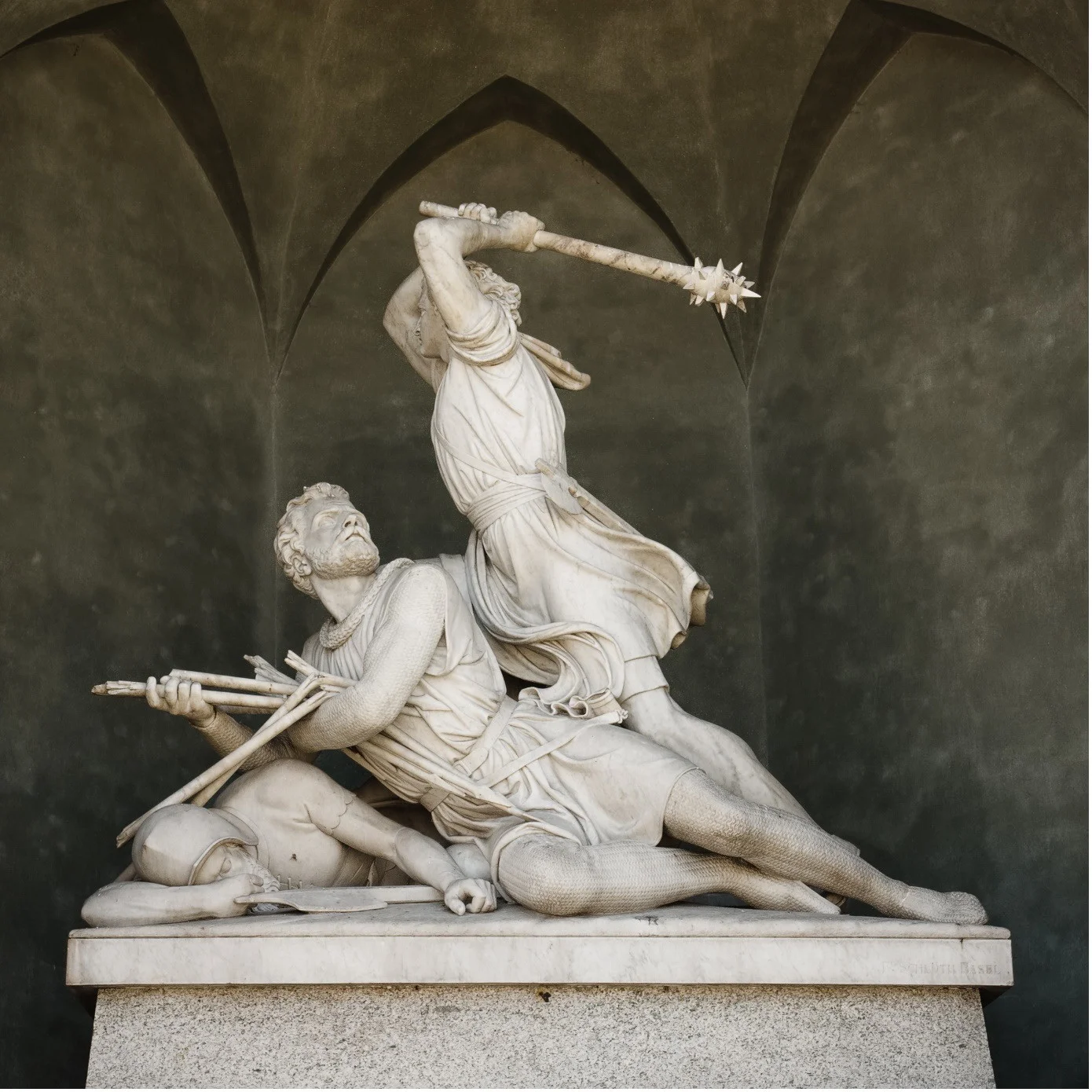 Noch sind die Wunden da und die Verlierer des Sonderbundskrieges von 1847 nicht integriert. Wieder braucht es einen Generationenvertrag, und wieder hilft der Mythos Winkelried. Er wirkt mit an der Idee der Gemeinschaft. 1865 wird in Stans das Winkelried-Denkmal eingeweiht. Geschaffen hat es der Basler Ferdinand Schlöth. Es steht ganz im Zeichen des Historismus. Am Boden liegt der tote Kämpfer. Er stellt die Vergangenheit dar, die Vorfahren. Mit ihrem Opfertod haben sie das Fundament gelegt. Lange Zeit zuvor. Die mittlere Figur repräsentiert die Söhne der Vorfahren. Sie opfern sich hier und heute – mit Blick auf die nachrückende Generation. Der junge Kämpfer, der sich über seine beiden Vorfahren hinwegsetzt, verkörpert darum die Zukunft.
