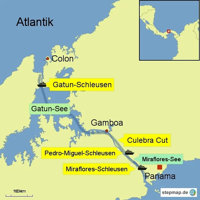 Nach dem Culebra Cut, auch Gaillard-Durchstich genannt, werden die Schiffe bei der Pedro-Miguel-Schleuse in den künstlich aufgestauten Miraflores-See gesenkt. Nach Querung des Sees werden sie bei den Miraflores-Schleusen wieder auf Meereshöhe zum Pazifik hinuntergelassen.