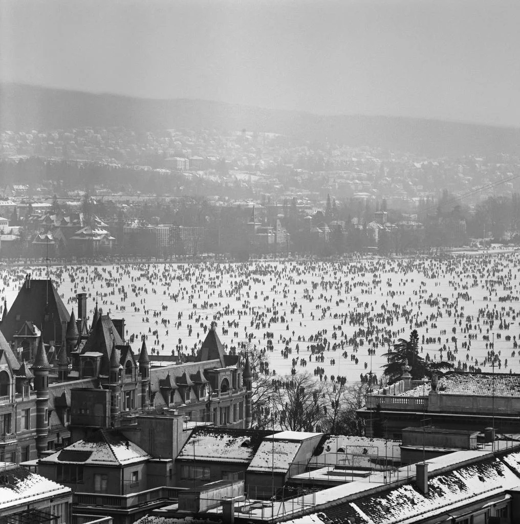 Vor 50 Jahren begann in Zürich ein seltenes Volksfest. Ende Januar wagten sich die Ersten auf den vollständig zugefrorenen Zürichsee. Die Eisfläche wurde am 1. Februar für die Bevölkerung freigegeben. Zehntausende begaben sich bis Anfang März auf die über 30 Kilometer lange Eisfläche. Das Bild stammt vom 11. Februar 1963. Der Dialektbegriff "Seegfrörni" wurde in diesem Jahr in den Duden aufgenommen. (Foto: Keystone/Photopress Archiv/str/axa)