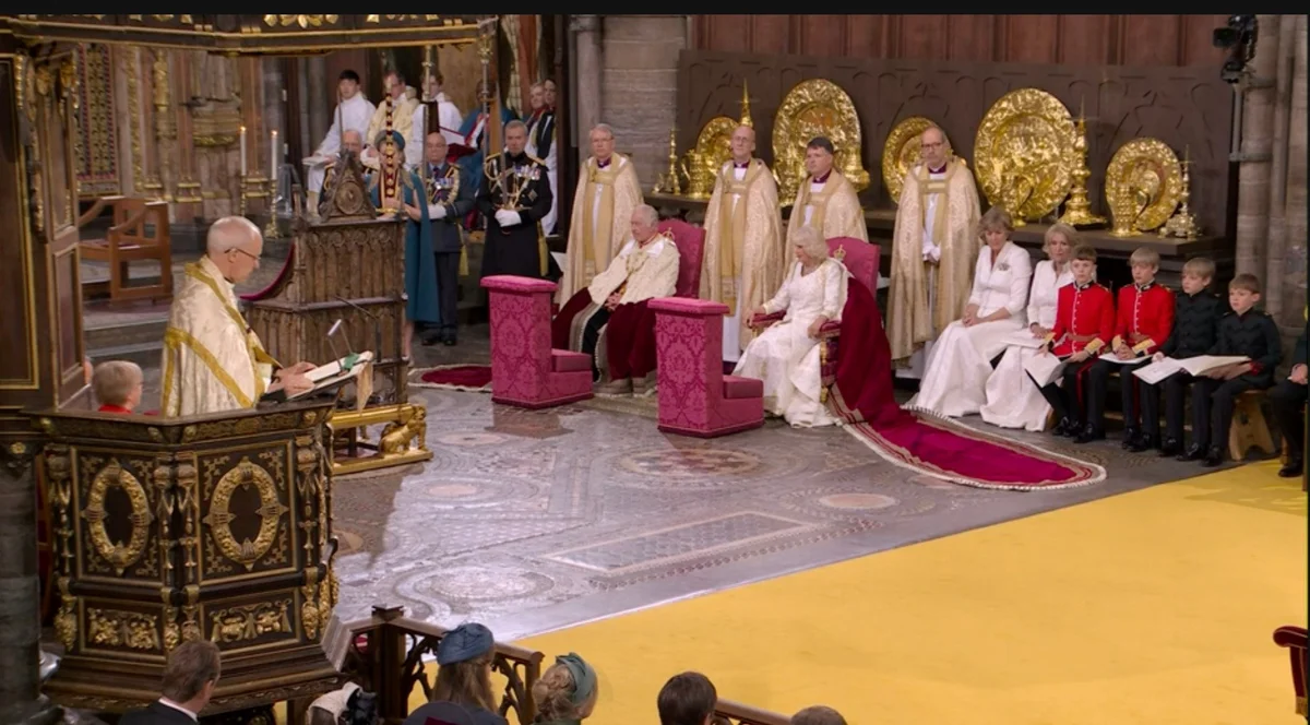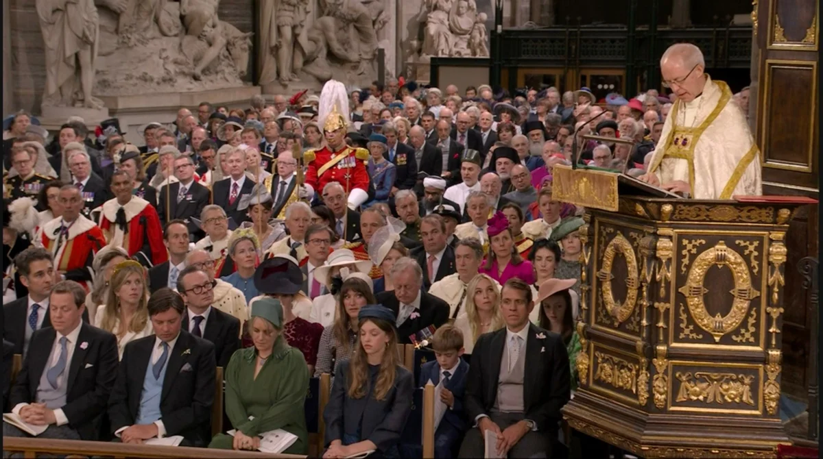 Um 12.30 Uhr legte Charles in der Westminister Abbey den Krönungseid ab. Justin Welby, der Erzbischof von Canterbury, sprach zunächst den Krönungseid – eine gesetzliche Vorschrift. Anschliessend bat Welby König Charles zu bestätigen, dass er während seiner Regentschaft das Gesetz und die Kirche von England aufrechterhalten wird. Der König legte daraufhin seine Hand auf das heilige Evangelium und versprach, diese Versprechen zu «erfüllen und zu halten». Charles legte zudem einen zweiten Eid ab, der besagt, dass er «ein treuer Protestant» ist.
