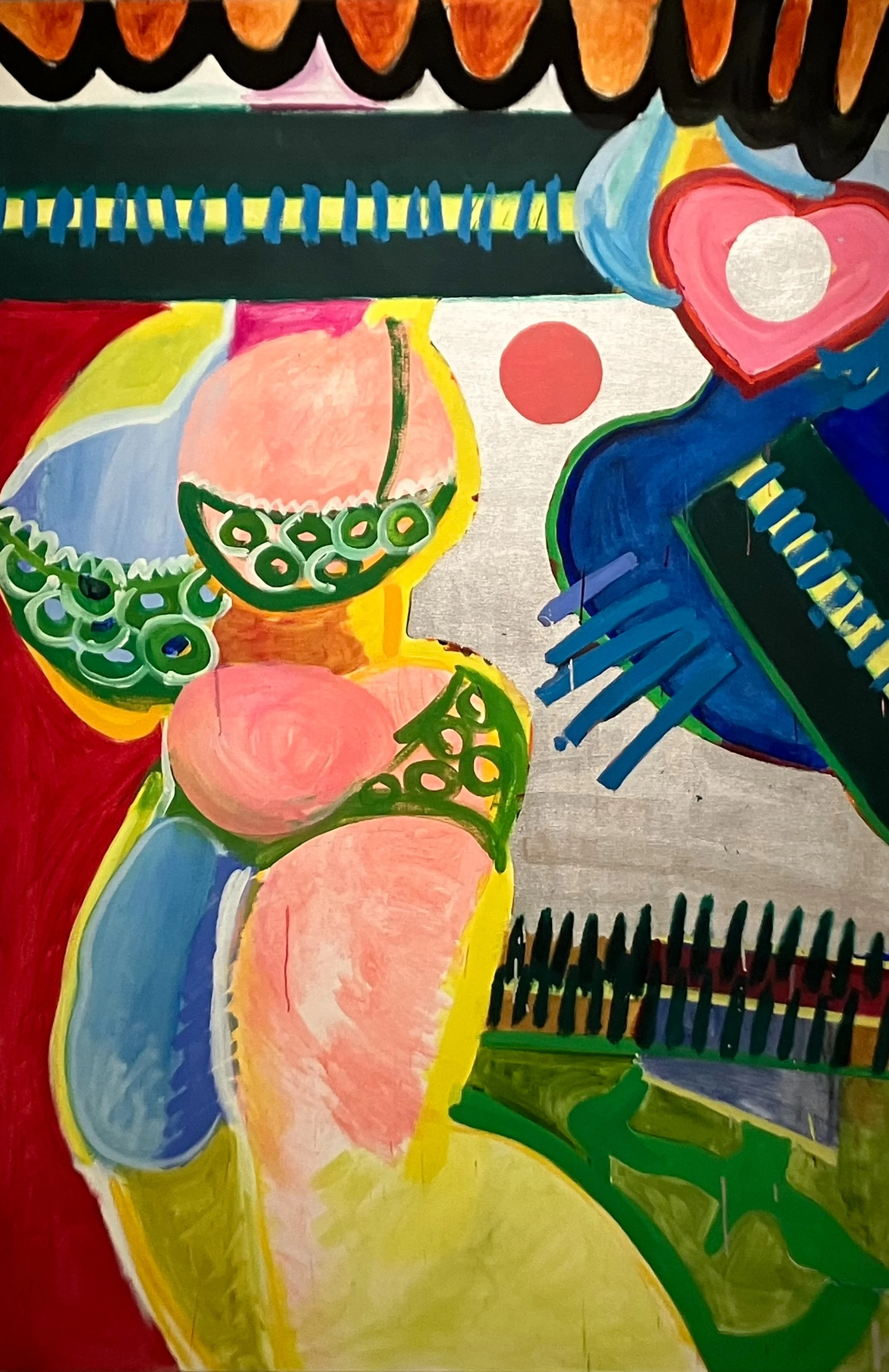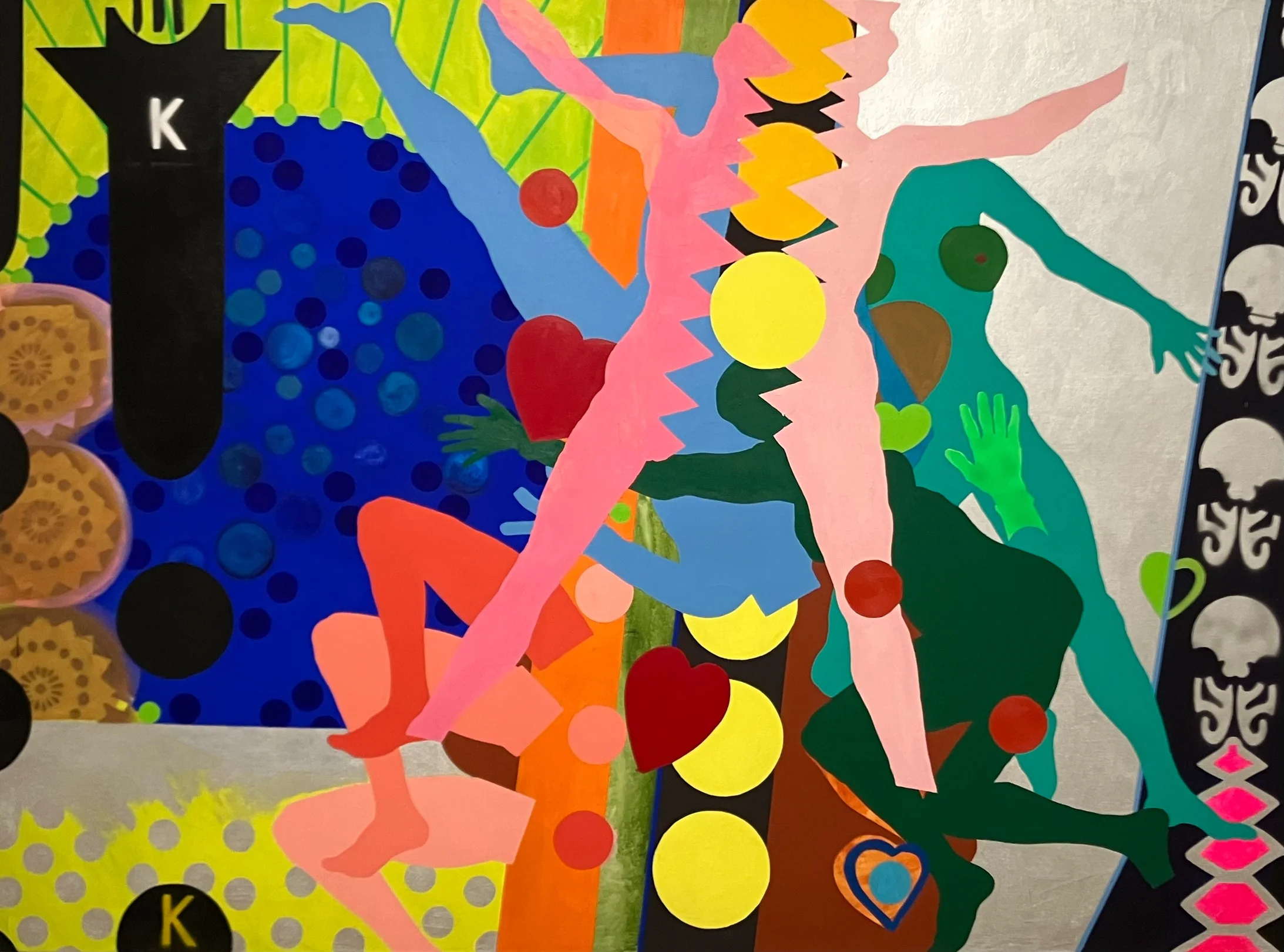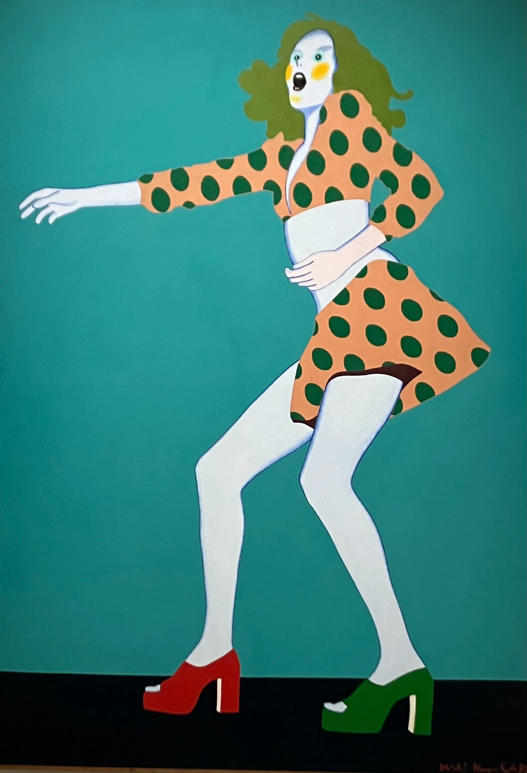 Kiki Kogelnik mochte, so lässt sich aus der Zürcher Schau ableiten, da kaum einfach mitmachen. Sie malte wohl in den 1970er Jahren in grossen Formaten Frauen, nach neuesten Modejournalen leicht und ihre jugendlichen Körperformen schmeichelnd gekleidet, aber selbstbewusst und kräftig ausschreitend oder in fröhlicher Lebenslust tanzend. Da ist nichts von den gleichzeitig entstandenen aufreizend posierenden Reklamefiguren von Mel Ramos und nichts von der zelebrierten, aber flachen Erotik Tom Wesselmanns. Stilistische Nähe zur Pop Art wird man aber schon feststellen – in der flächigen, auf jedes Relief verzichtenden Malweise, in den deutlich zeichnenden Konturen, in den klar gesetzten Farben.
