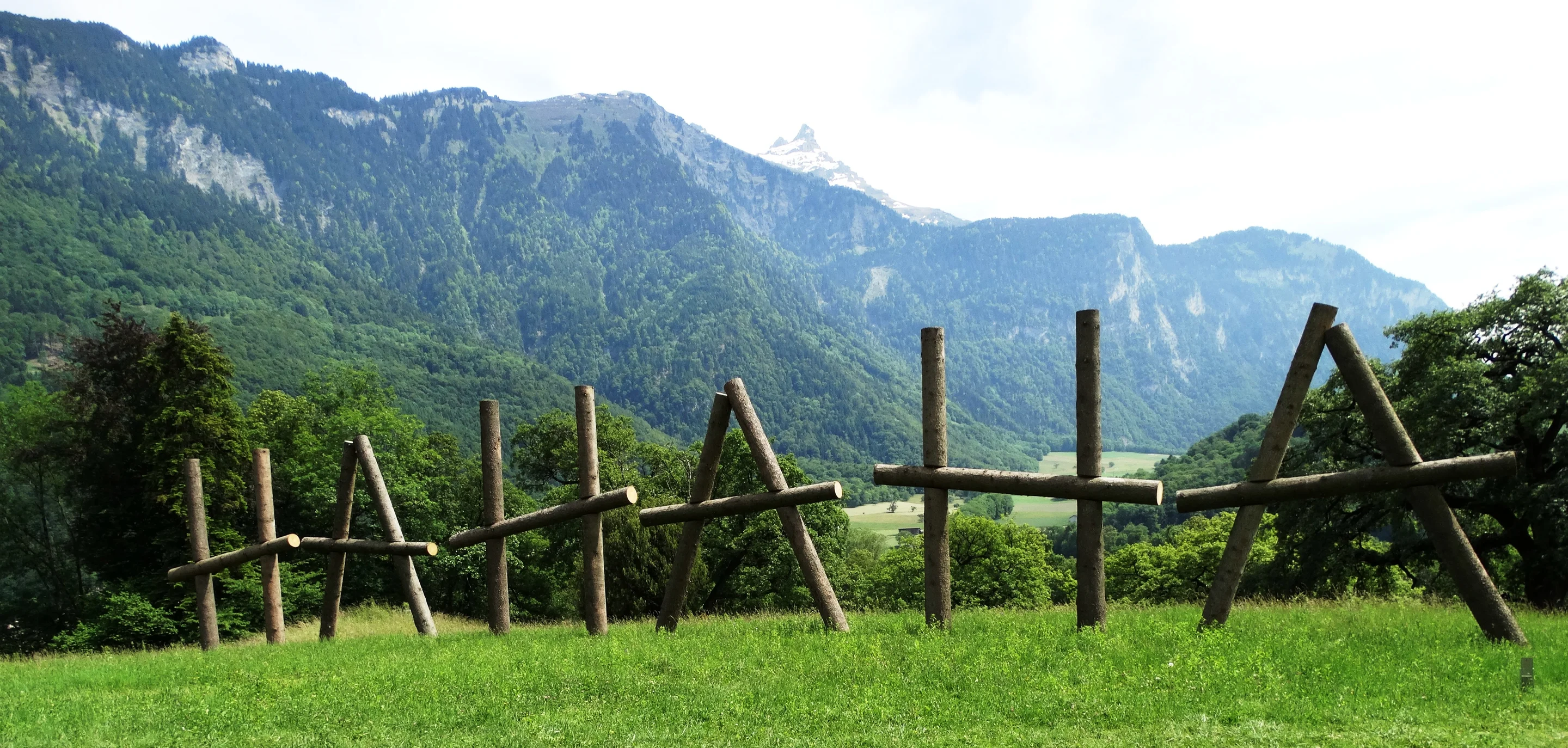 Was in der diesjährigen Ausstellung vermisst wird, sind sicher die grossen spektakulären Installationen, die in früheren Jahren prägend und besonders attraktiv wirkten. An originellen Highlights fehlt es in Bex diesen Sommer jedoch keineswegs. Dazu zählt eindeutig die amüsante und geniale Wort-Konstruktion der Waadtländerin Claudia Comte. HAHAHA wurde aus riesigen, rohen Baumstämmen und mit übergrossen Nägeln zusammengezimmert. Ein gigantischer Schriftzug, der Ironie, Gleichgültigkeit , Freiheit, eine Spur Arroganz und Distanzierung zu allem Umgebenden anzeigt. Das Werk. wie aus dem Boden gewachsen, dominiert die Landschaft, steht im oberen Teil des Parks, direkt gegenüber der Dents du Midi.