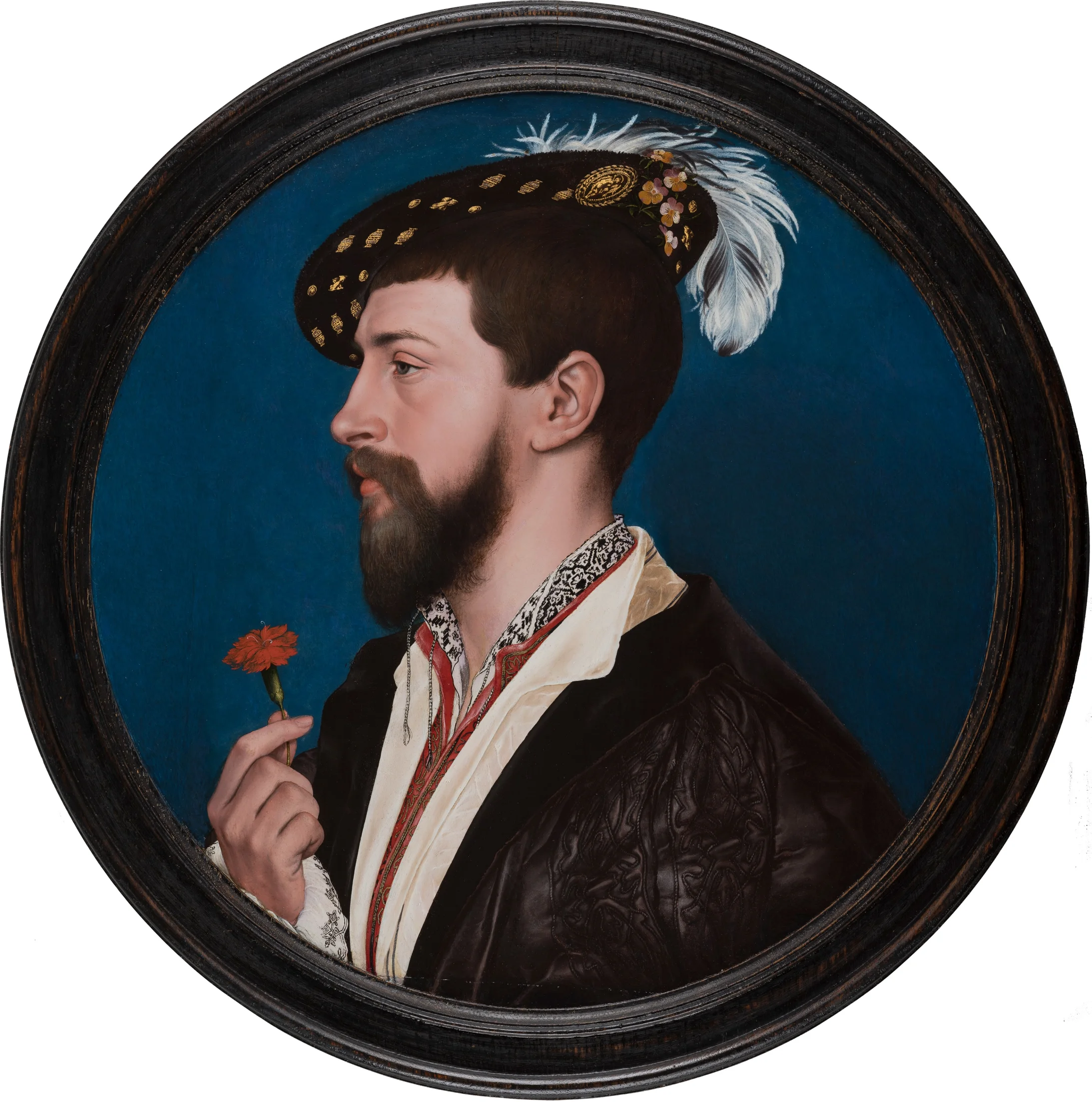 Der elegant gekleidete junge Mann mit der Nelke in der Hand scheint auf Brautschau. Das Porträt, kompositorisch und maltechnisch perfekt und mit dem für den späten Holbein typischen seidenen Glanz des Farbauftrags, entstand erst ca. 1535–1540, also ausserhalb des Zeitfokus der Ausstellung. Auf dieses «schönste Bild der Welt», so Städel-Direktor Philipp Demandt (mit selbstironischem Unterton des Verliebten?), wollte man nicht verzichten. Das Bildnis prangt denn auch, wie der Kopf der Darmstädter Madonna, als Grossplakat an der Fassade des Städel Museums – als Werbung für «Holbein und die Renaissance im Norden». Da ist keine Frage mehr, welcher Holbein denn gemeint sei.