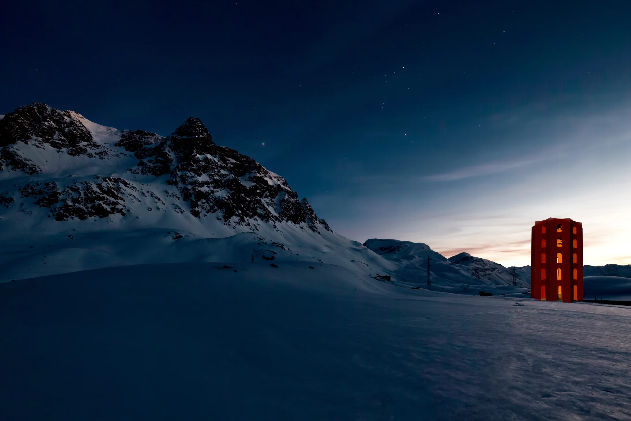 Der mehrstöckige rote Bau mit 300 Sitzplätzen wird für einige Jahre auf dem Julier sommers wie winters bespielt werden. Er muss Orkanen von bis zu 250 Stundenkilometern Heftigkeit widerstehen, Schnee- und Staublawinen aushalten, dicht sein für Regengüsse. Ein solcher Wind weht nach heutigen Erkenntnissen alle fünfzig Jahre – also könnte er im ersten Winter losheulen.