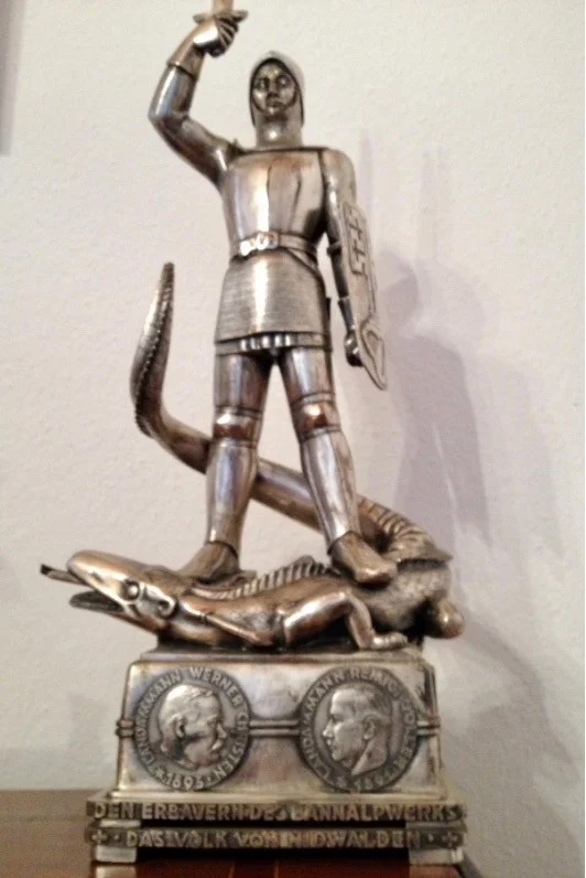 [7] Ein zeittypisch verfasster Text steht auf der Rückseite der kleinen Statue: «In nomine Domini. In Dankbarkeit gewidmet den Hochgeachteten Landammännern Werner Christen und Remigius Joller, die – wie weiland Struthan den Drachen bezwang – in jahrelanger selbstloser Arbeit alle unendlichen Schwierigkeiten beim Bau des kantonalen Elektrizitätswerkes überwanden und damit das bisher grösste wirtschaftliche und gemeinnützige Unternehmen in Nidwalden schufen, zu Nutz und Frommen von Land und Volk – Weihnachten 1941».