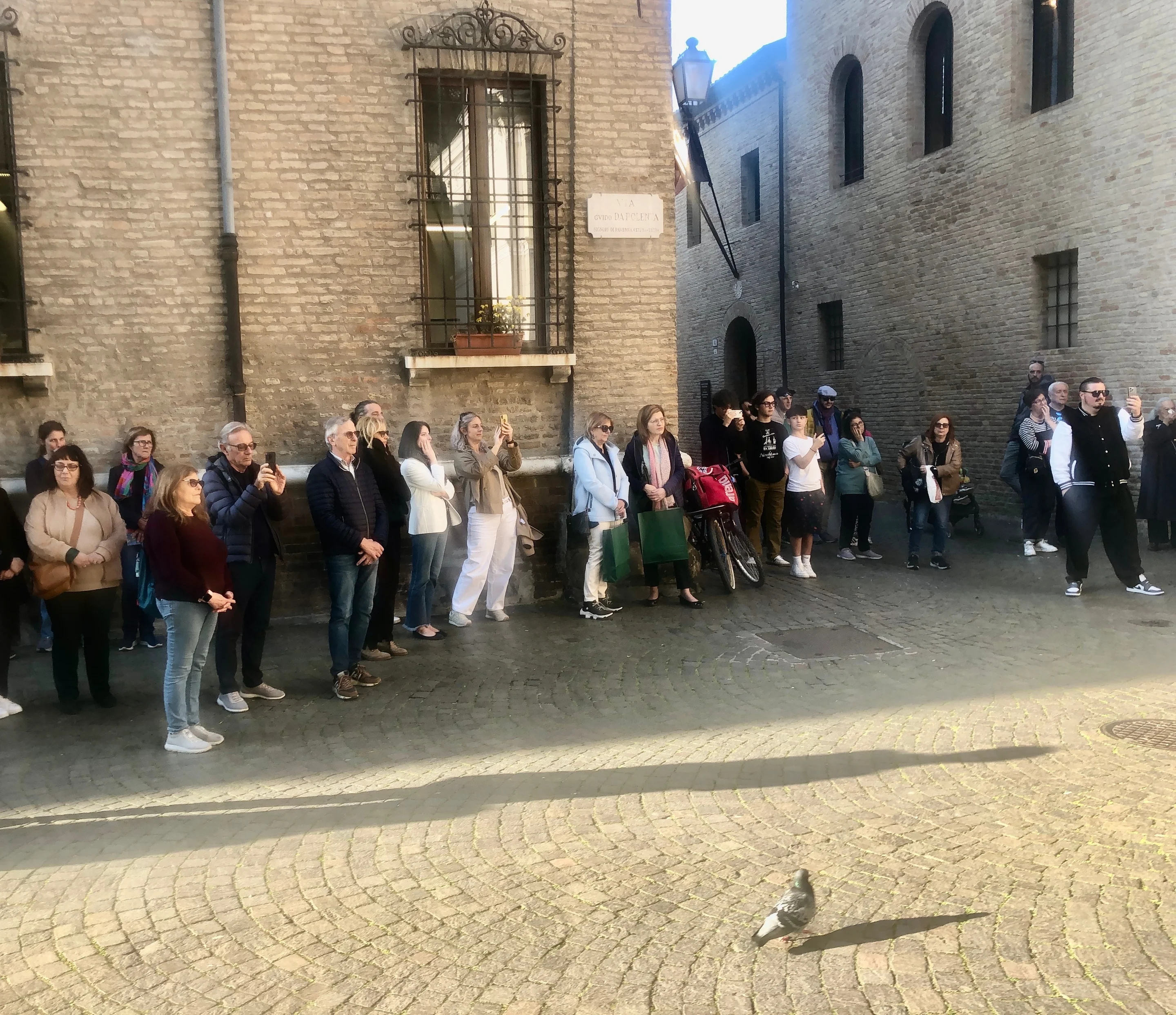 Die Menschen treffen sich hier, um einige Verse von Dante zu hören – rezitiert von jungen Menschen, von Studentinnen und Studenten, von Künstlern und Künstlerinnen, auch von Schülerinnen und Schülern.
