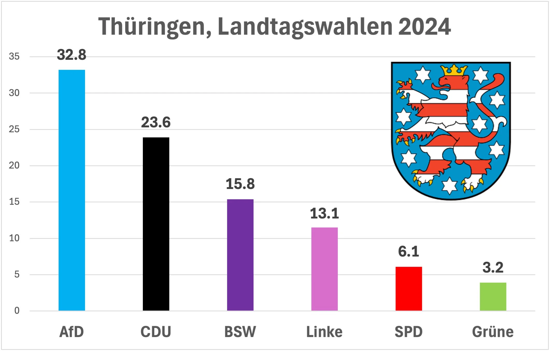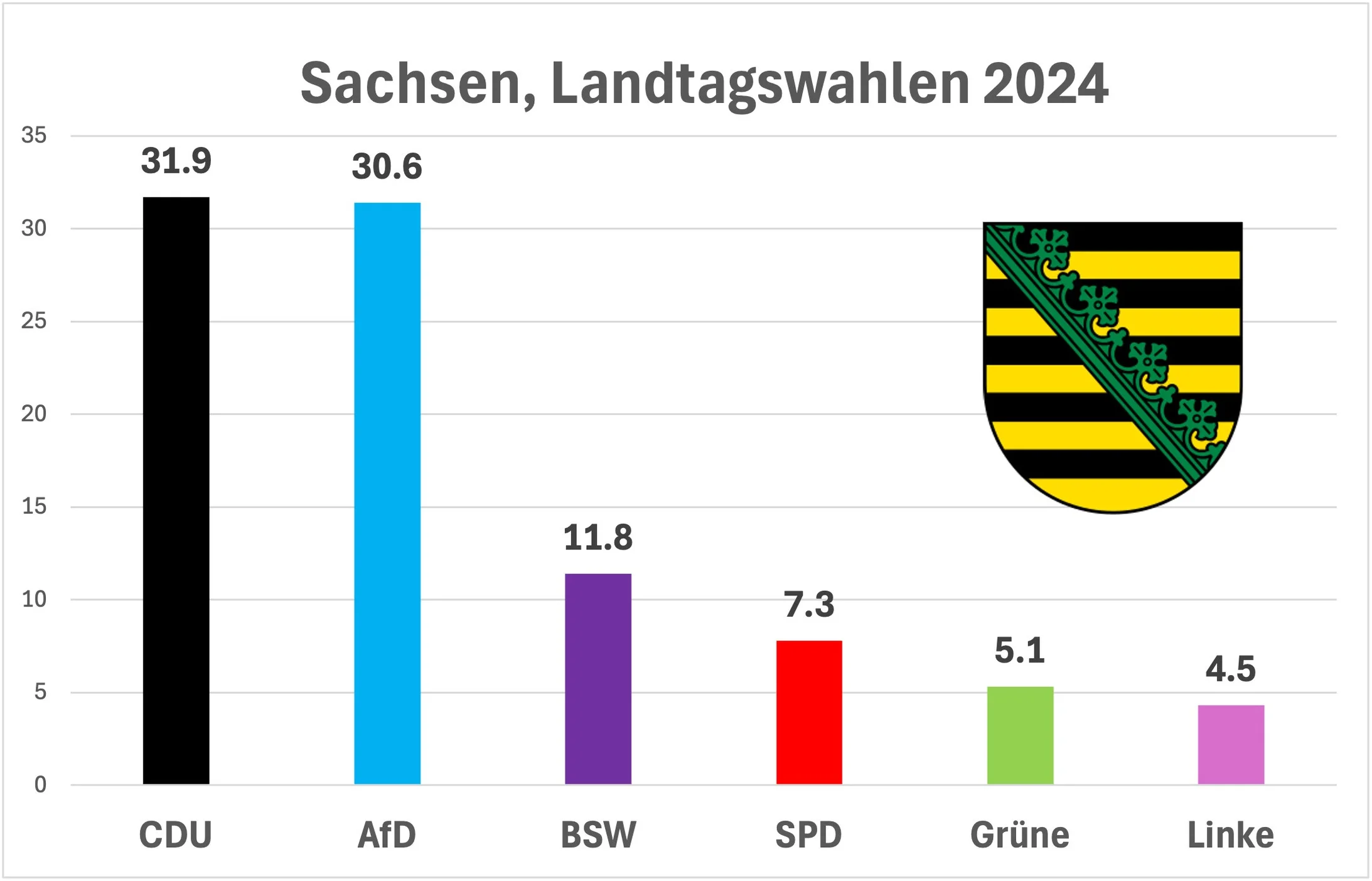 Die Linke erleidet einen eigentlichen Absturz. Sie kommt in Sachsen noch auf 4,5 Prozent (minus 5,9%) und in Thüringen auf 13,1 Prozent (minus 18%) der Stimmen. Auch die SPD, die Grünen und die FDP verlieren.