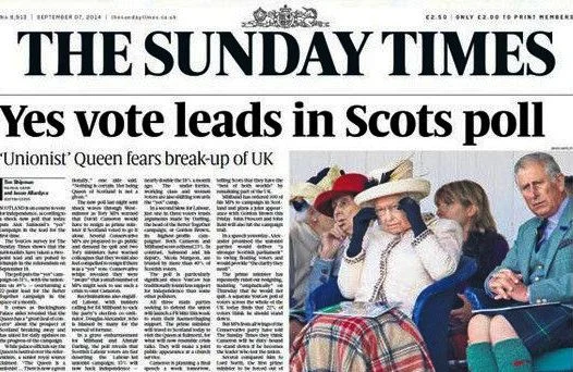 In der in der Sunday Times publizierten Umfrage befürworten 51 Prozent der Schottinnen und Schotten eine Abspaltung Schottlands von England. Die Fehlerquote der Umfrage beträgt plus/minus 4 Prozent. Es ist das erste Mal, dass eine Umfrage eine Ja-Mehrheit aufweist. Abgestimmt wird am 18. September.