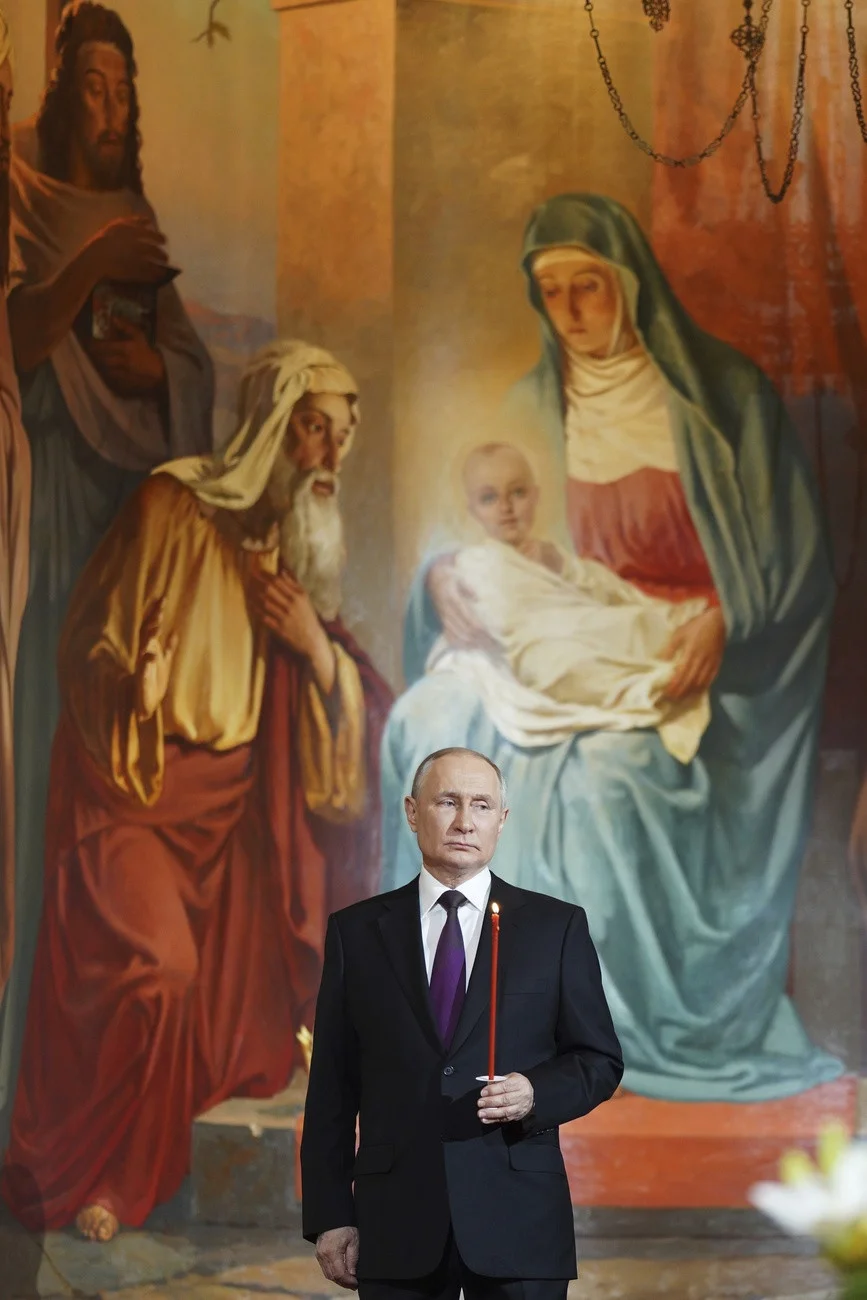 Mehr noch: Manchmal verklausuliert, manchmal offen, lässt er durchblicken, dass er nach der Eroberung der Ukraine nicht haltmachen werde. In den drei baltischen Staaten, in Polen, in Moldawien, in Georgien verfolgt man die Entwicklung mit Sorge. Der Zerfall der Sowjetunion war für Putin ein Trauma. Er spricht von «Heimholung russischer Erde». Er hat eine Mission; er will Russland zur alten Grösse zurückführen. Er zitiert «Peter den Grossen» (1672–1725), denkt an «Katharina die Grosse» (1729–1796). Er will als «Wladimir der Grosse» in die Geschichte eingehen. An Ostern lässt er sich in der Moskauer Erlöserkathedrale vor einem Heiligenbild mit Jesus und Mutter Maria fotografieren (siehe oben).