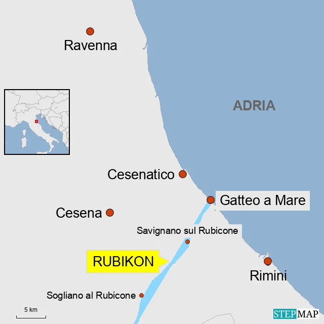 Laut offiziellen Quellen mündet das damalige Grenzflüsschen Rubikon südlich von Ravenna in die Adria. Die Wissenschaftler waren sich lange Zeit nicht ganz einig, ob der «offizielle Rubikon» wirklich «Cäsars Rubikon» (Italienisch: Rubicone) ist.
