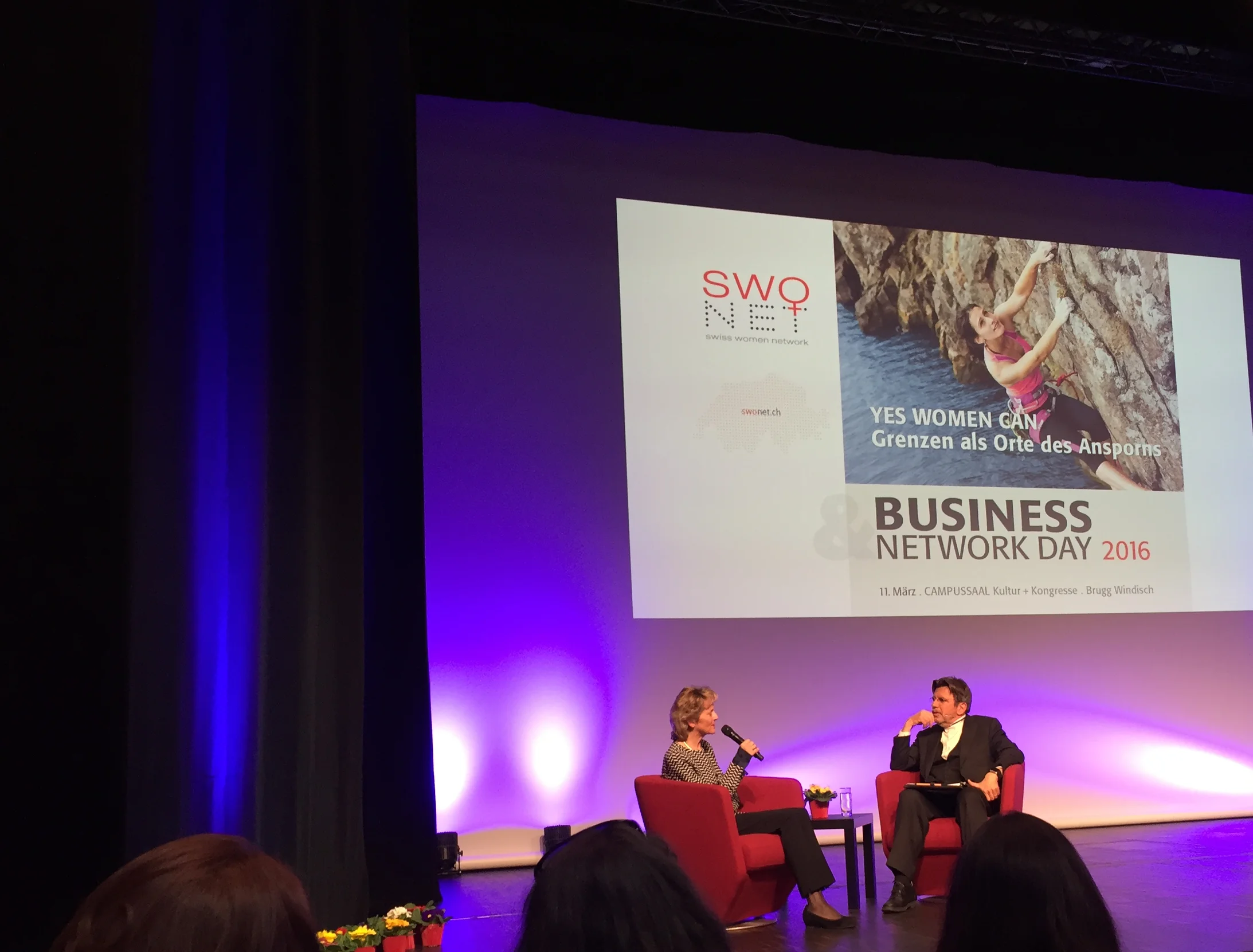 Eveline Widmer-Schlumpf erzählte von ihren Grenzen und vom Ansporn, den sie auf allen Ebenen der politischen Arbeit erlebt hatte, durch die Anerkennung und Mitwirkung in diversen Frauenorganisationen: „Wir sprechen die gleiche Sprache“. Ihrer Meinung nach stehen viele Frauen sich auch selbst im Weg, aber solche subjektiven Grenzen können Menschen am besten zusammen überwinden, auch durch Mentoring. Es sei für sie in den schwierigen Momenten als Bundesrätin ein gutes Gefühl gewesen, dass die Frauenorganisationen in einer Demonstration volle Unterstützung zeigten, so dass sie sich nie allein fühlte.