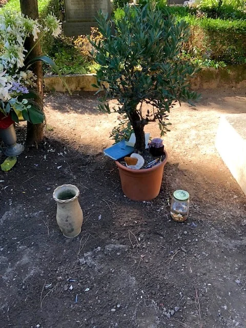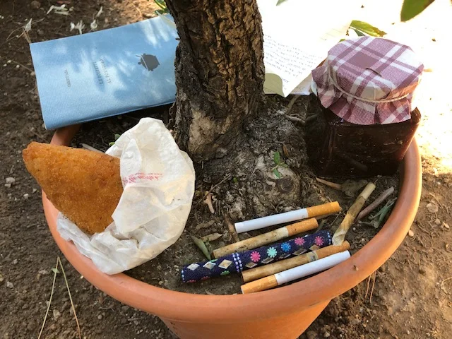 Ein Olivenbäumchen steht hier. Jemand legte Zigaretten hin, damit der Kettenraucher Camilleri im Jenseits nicht darben muss. Doch ans Jenseits glaubte Camilleri nicht.