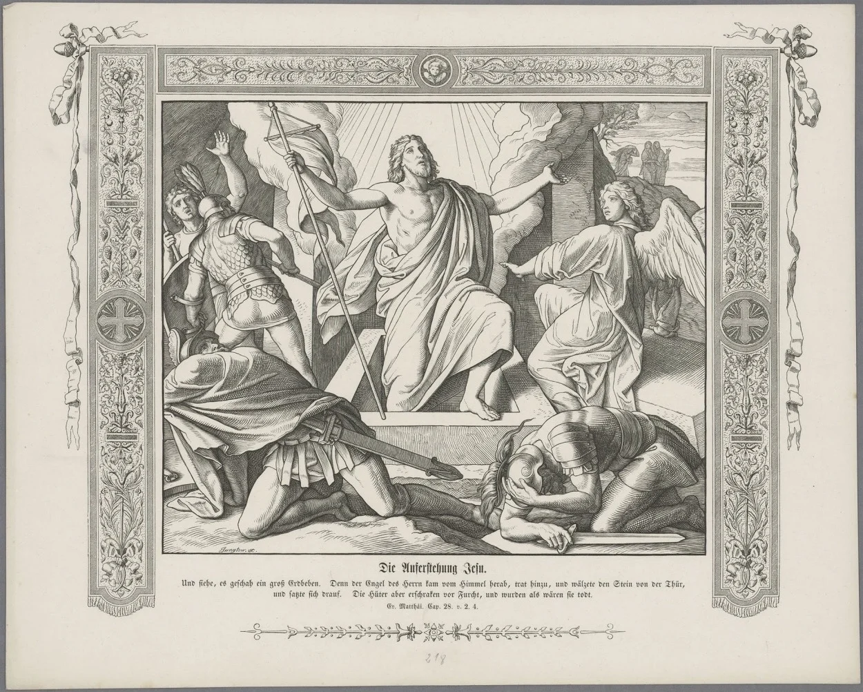 Für Letztere steht exemplarisch der Bibelillustrator Julius Schnorr von Carolsfeld mit seinen für die populären Glaubensvorstellungen typischen «realistischen» Wunderdarstellungen. Die Art, wie er etwa die Auferstehung inszeniert (Bild ganz oben), geht in ihrer expliziten Schilderung des Vorgangs weit über die biblischen Texte hinaus und behauptet eine illusorische Tatsächlichkeit, indem sie gewissermassen sagt: Schaut, so war es!