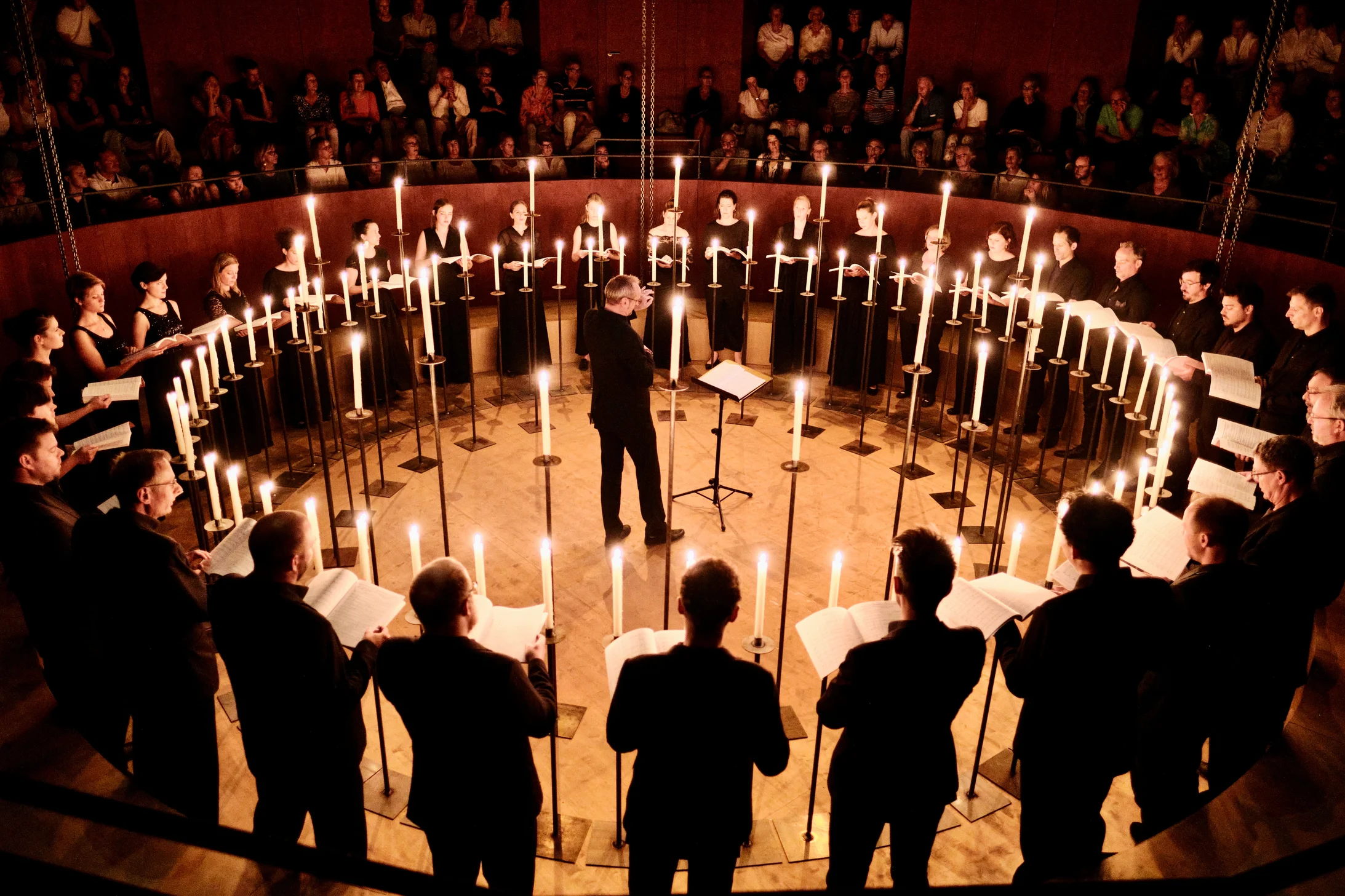 Das «Ensemble Vocal Origen» ist auf der kreisrunden schwebenden Bühne aufgestellt, beleuchtet zum grossen Teil (aber nicht nur…) von Kerzen. Unter der Leitung von Clau Scherrer erklingt diese Vesperliturgie, ganz ohne Instrumente. Es sollte Rachmaninows letzter Beitrag zur russisch-orthodoxen Kirchenmusik werden. 1915 in Moskau uraufgeführt, erklingt es ganz in der russischen Chor-Tradition. Insbesondere die tiefen Bass-Stimmen wirken fremd und betörend. Für Rachmaninow selbst ist die damalige Uraufführung zur «Stunde der glücklichsten Befriedung» geworden. Zwei Jahre später ging er ins Exil. Seine geistlichen Werke hatten bei den neuen kommunistischen Machthabern keine Gnaden mehr gefunden.
