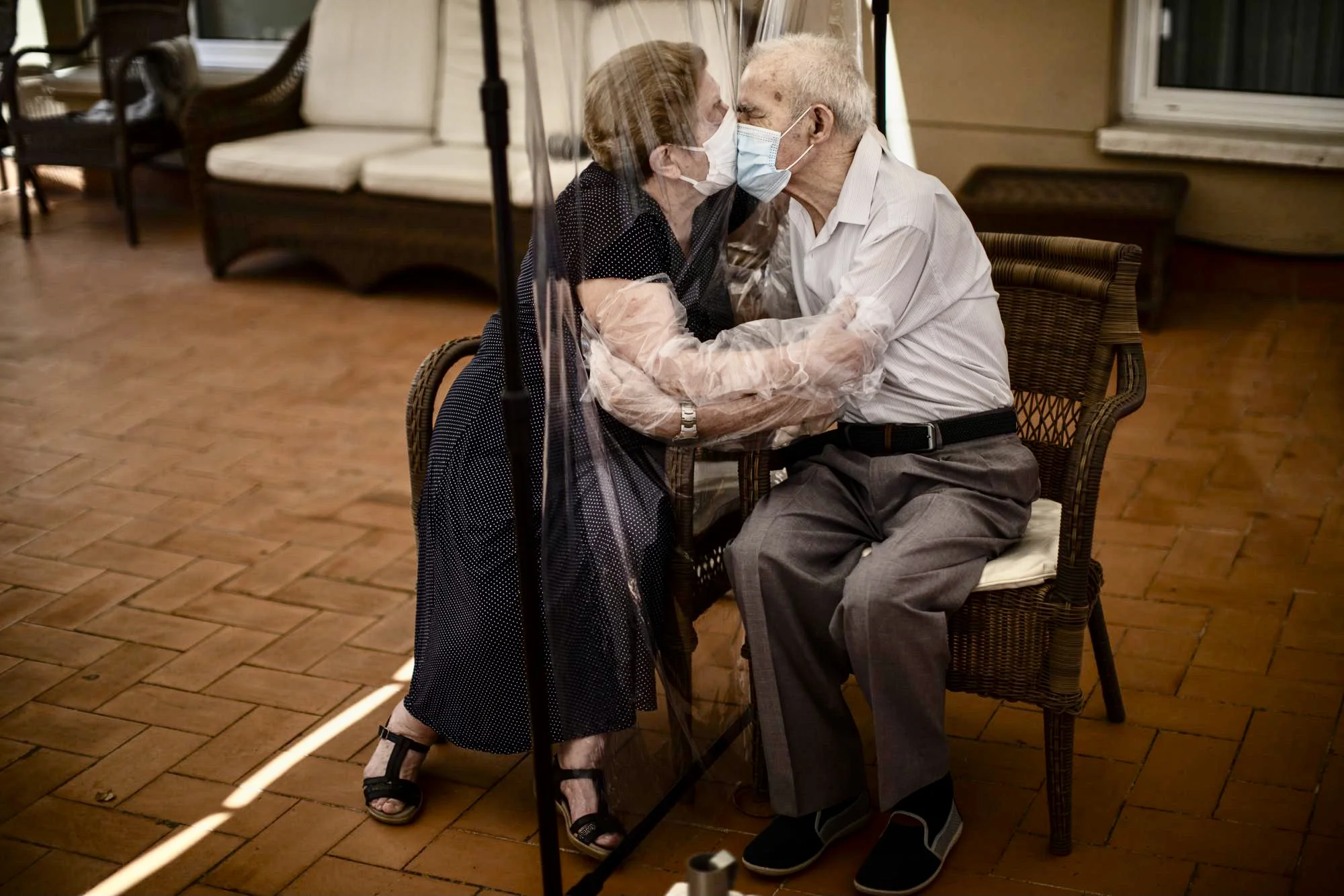 Ein älteres Paar umarmt und küsst sich in Barcelona in Corona-Zeiten. Mit diesem Bild gewann Emilio Morenatti, der Chef-Fotograf von Associated Press (AP) in Spanien, den Pulitzerpreis für Reportagenfotografie.