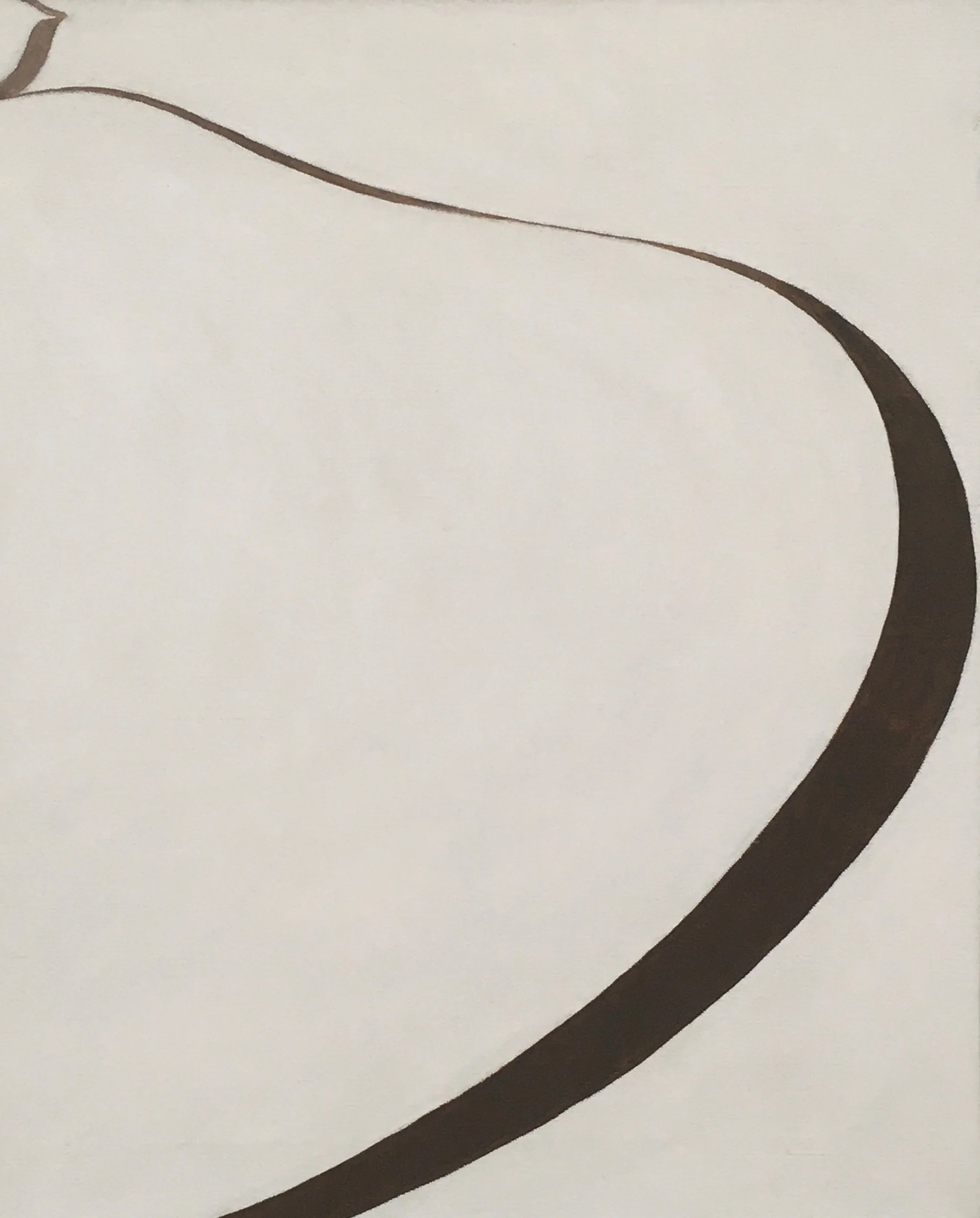 Oft nehmen aber Formen und Farben ein so ausgeprägtes Eigenleben an, dass der Realitätsbezug kaum mehr nachzuvollziehen ist. Beispiele dafür sind «Im Patio» von 1950 oder «Winter Road» von 1963: O’Keeffe legt eine braungraue, sich nach unten verbreiternde Linie in elegantem Schwung über die weisse Bildfläche. Gerade in diesen Werken von radikal reduzierter Bildsprache öffnen sich im Befragen der Orientierung im Raum existenzielle Dimensionen. Das geschieht, wie im ganzen Werk O’Keeffes, ohne Hinweis auf die Präsenz der menschlichen Figur.