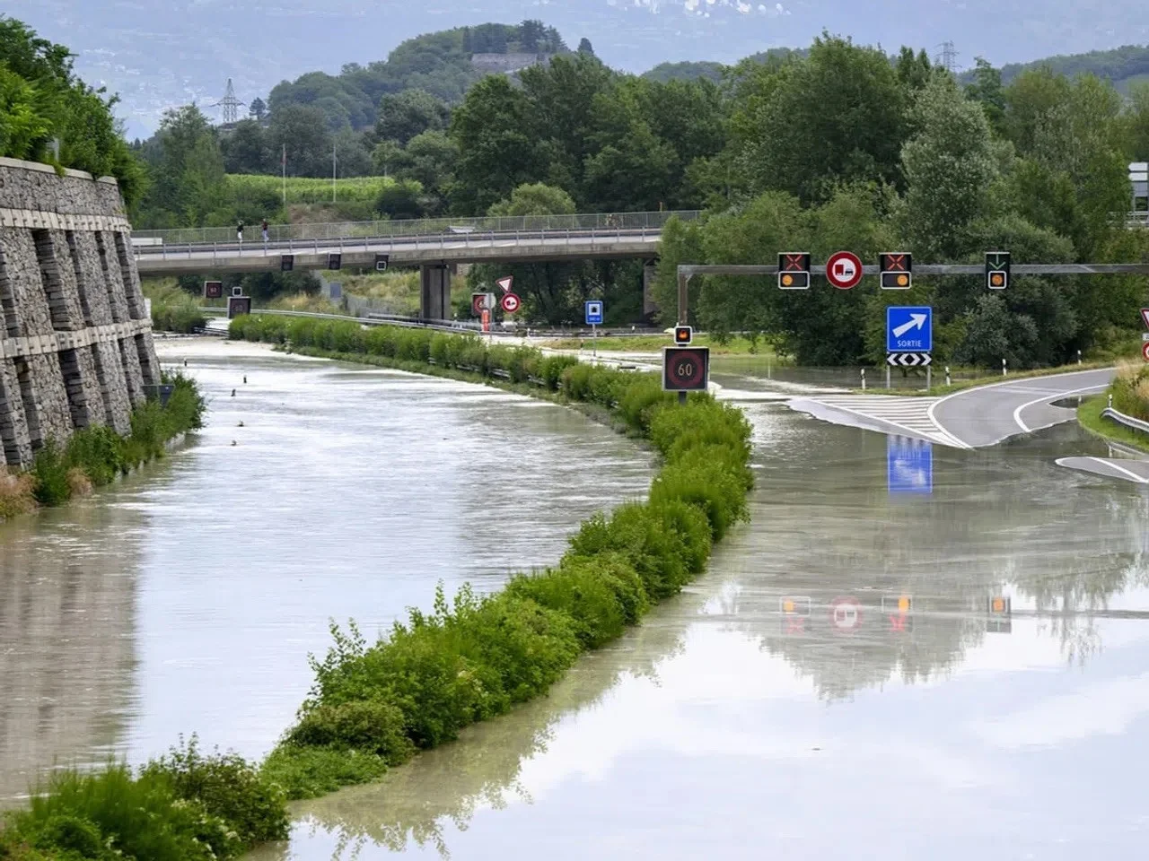 Die A9 bei Sierre/Siders ist überschwemmt. (Keystone/Jean-Christoph Bott)
