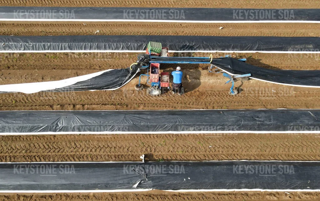 Im ostdeutschen Bundesland Mecklenburg-Vorpommern hat am Montag offiziell die Spargelernte begonnen. Die Luftaufnahme per Drohne zeigt die Erntearbeit in einem Bauernbetrieb, der an zwei Standorten insgesamt 80 Hektar Spargeln anbaut. Die Spargelernte in Deutschland beginnt ab Mitte April und endet traditionell am 24. Juni, dem Johannistag. Die grössten Spargelanbaugebiete befinden sich in Niedersachsen, Brandenburg und Nordrhein Westfalen.