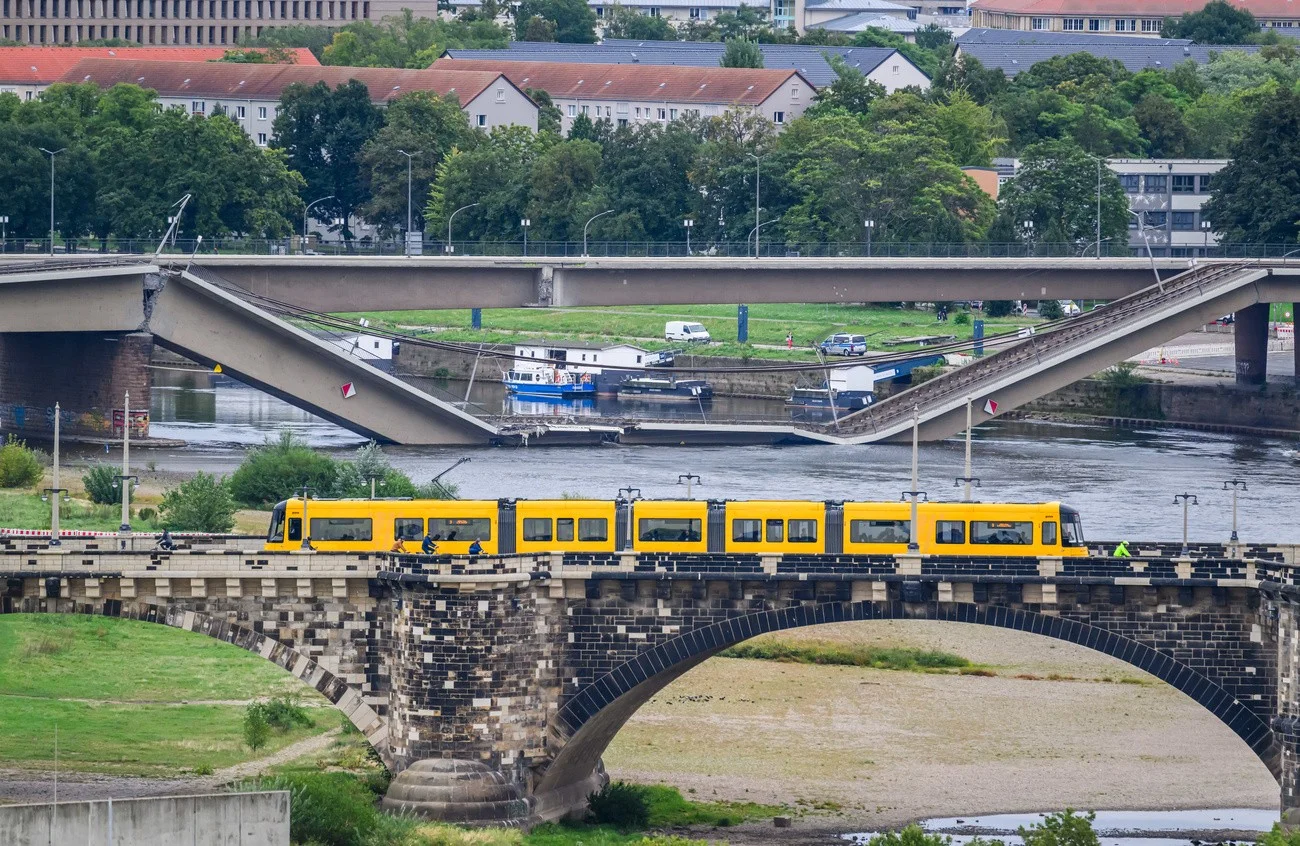 Blick auf die in der Nacht auf den Mittwoch teilweise eingestürzte Carolabrücke über die Elbe. Im Vordergrund die wesentlich ältere Augustusbrücke, die von einer Strassenbahn überquert wird und die offenkundig wesentlich solider gebaut ist. Die Carolabrücke wurde 1971 – also noch zu DDR-Zeiten – eröffnet. Sie besteht aus drei Brückenzügen, von denen der Teil C eingestürzt ist. Bei dem nächtlichen Einbruch ist glücklicherweise niemand verletzt worden.