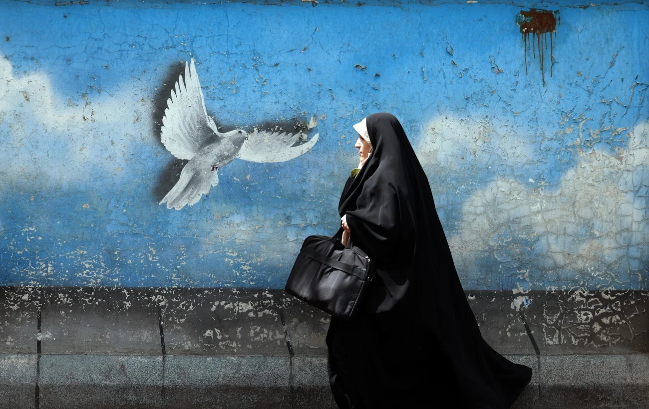Strassenszene in Teheran: Eine verschleierte Iranerin geht am Wandbild einer Friedenstaube vorbei. Ob die angekündigten Gespräche zwischen Iran und USA, die am 12. April in Oman über das iranische Atomprogramm stattfinden sollen, dem Frieden förderlich sein werden, ist angesichts der schroffen Haltung beider Seiten jedoch zumindest ungewiss.