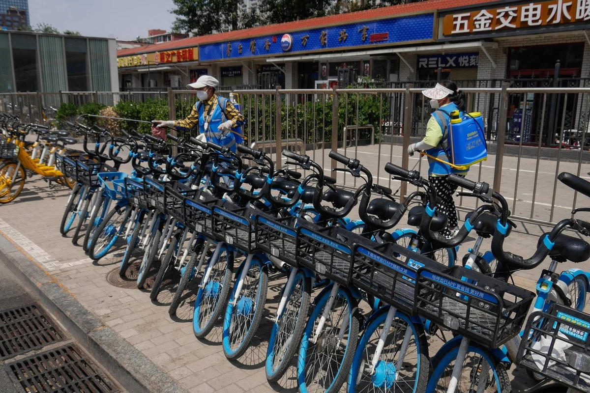 Desinfektion von Mietvelos in Peking. Die chinesische Hauptstadt wird weiterhin von punktuell strengen Massnahmen gegen die Ausbreitung des Covid-19-Virus überschattet. In Schanghai haben die Behörden für den 1. Juni eine Lockerung des seit Wochen geltenden Lockdowns angekündigt. Die Null-Covid-Strategie der Pekinger Regierung hat das Wachstum der chinesischen Wirtschaft deutlich reduziert. (Foto: Keystone/EPA/MARK R. CRISTINO)