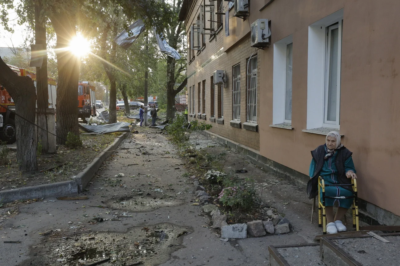 Alltäglicher Raketenterror in der ukrainischen Hauptstadt Kiew. Eine ältere Frau vor ihrem Wohnhaus im Stadtteil Darnitski, wo in der Nacht auf den Donnerstag Teile von russischen Raketen aufgeschlagen sind. Nach Angaben der Behörden sind in dieser Nacht 43 russische Raketen gegen die Hauptstadt gefeuert worden, 36 davon konnten von der Luftabwehr abgeschossen werden. Im Stadtteil Darnitski sind mehrere Feuer ausgebrochen, sieben Menschen wurden verletzt, mehrere Wohnungen verwüstet.